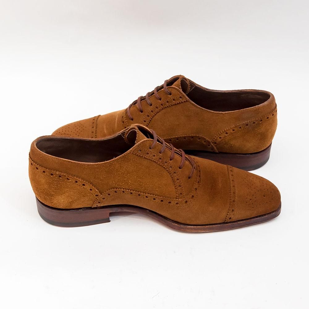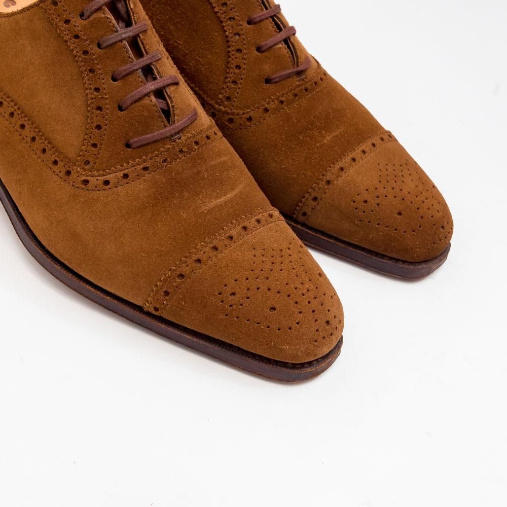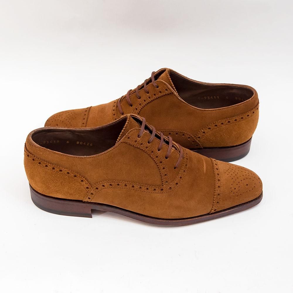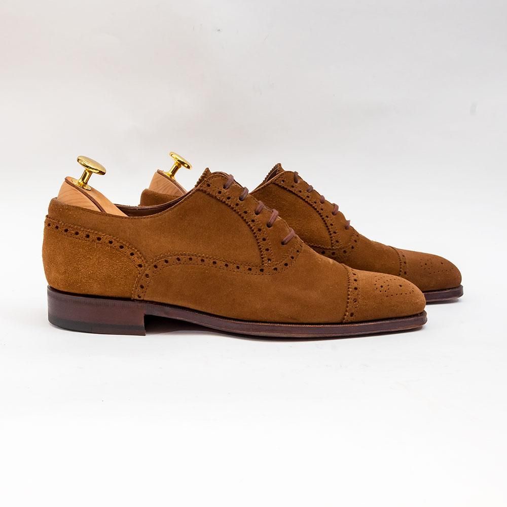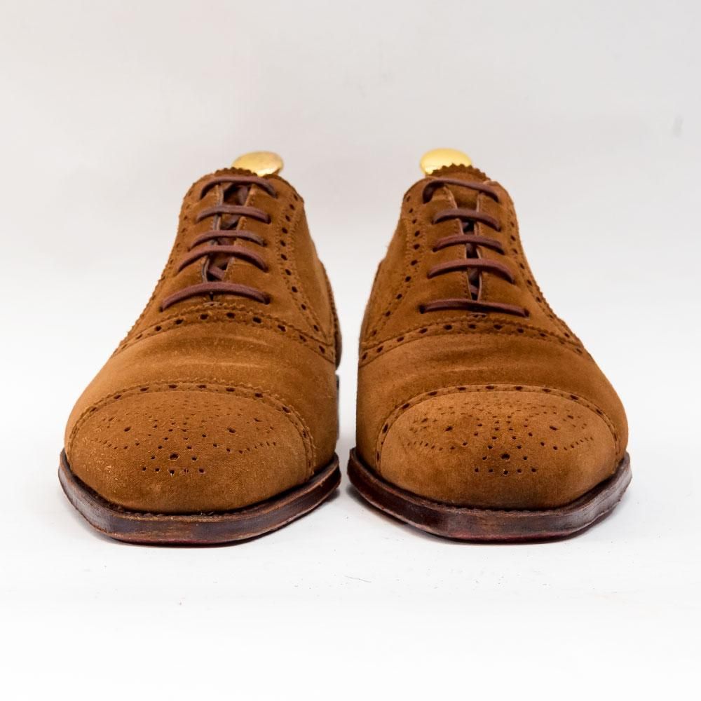 カントリーチックになりやすいライトブラウンスエードのセミブローグを細身のORIENTラストと控えめなメダリオンの組合わせによってモダンに仕上げられた一足。トップリフト新品に交換済です。