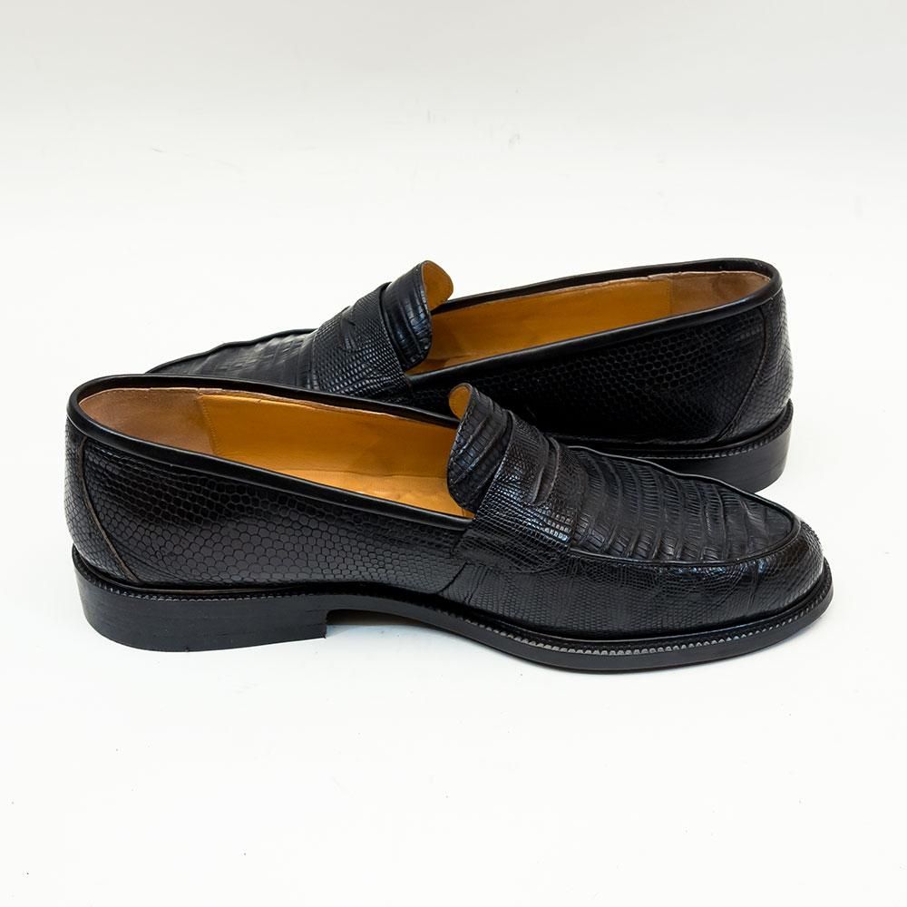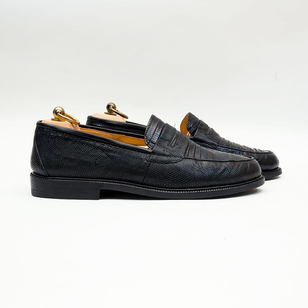 あまり見かえることが少ないブラックのリザードを全面に施したコインローファー。ブラックなので派手派手しさもなく、フランス靴らしい上品に足元を飾ることができます。定価推定10万円前後