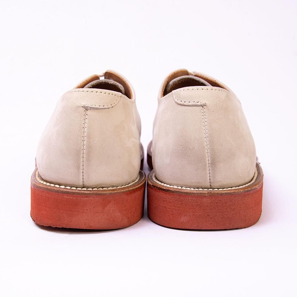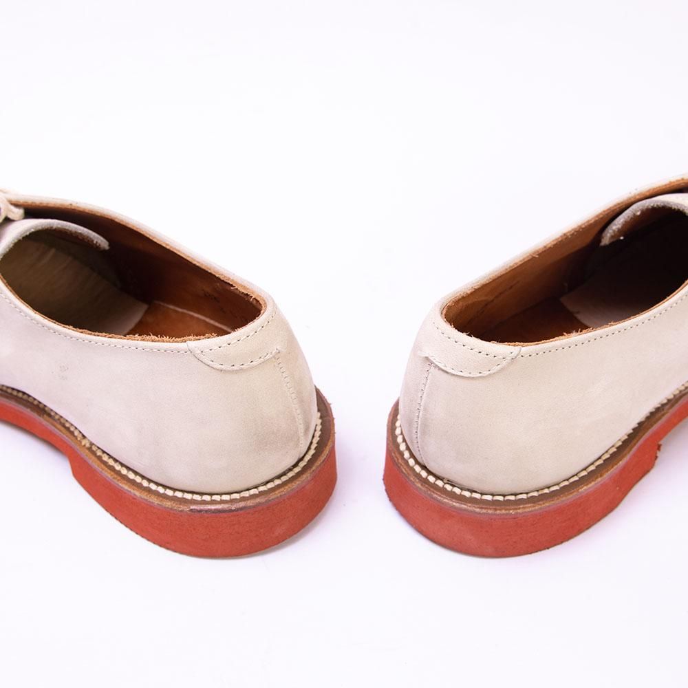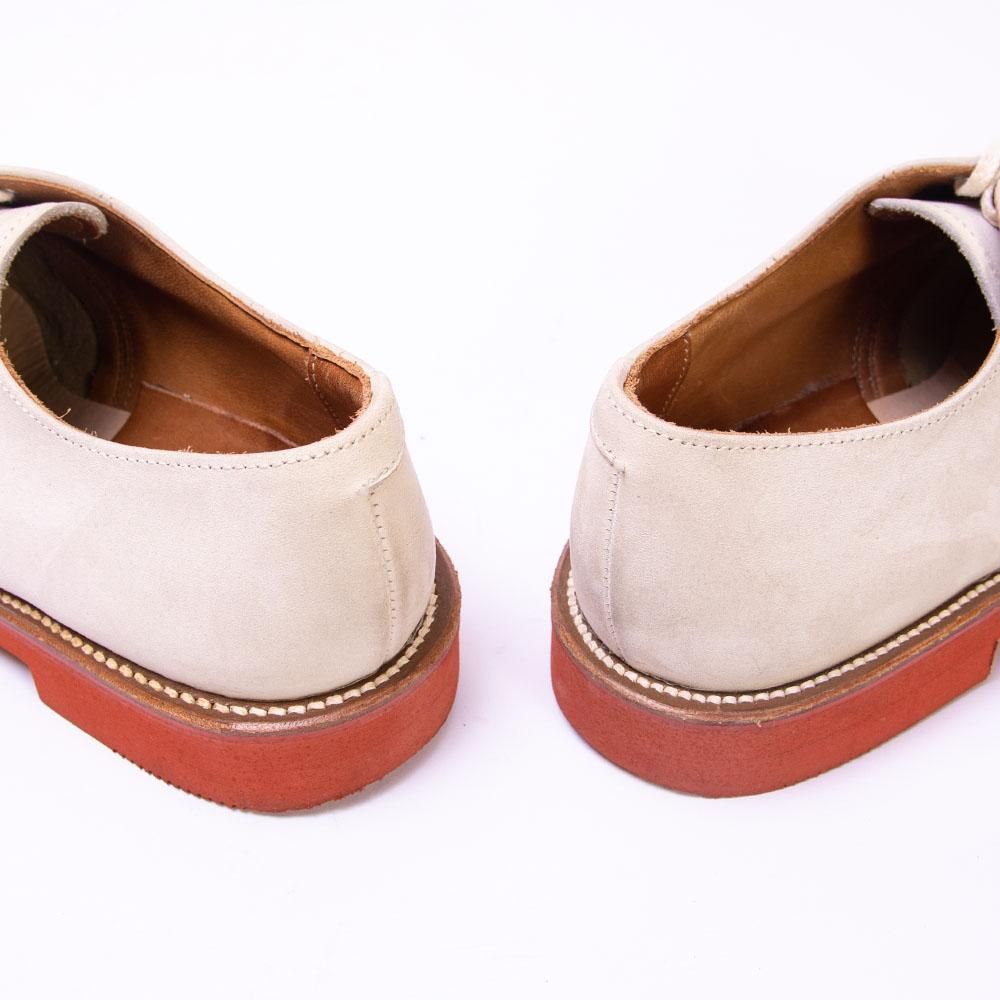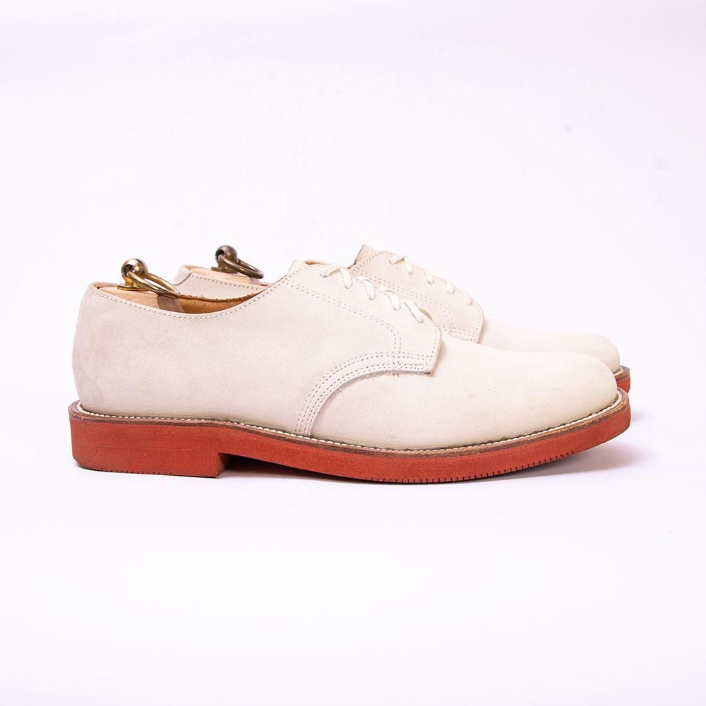 アメリカントラッドスタイルを地で行く老舗ブランドのウォークオーバー。アイコニックなレンガソールとも言われる赤土色のラバーソールとオフホワイトのバックスキンの対比が爽やかに仕上がっています。