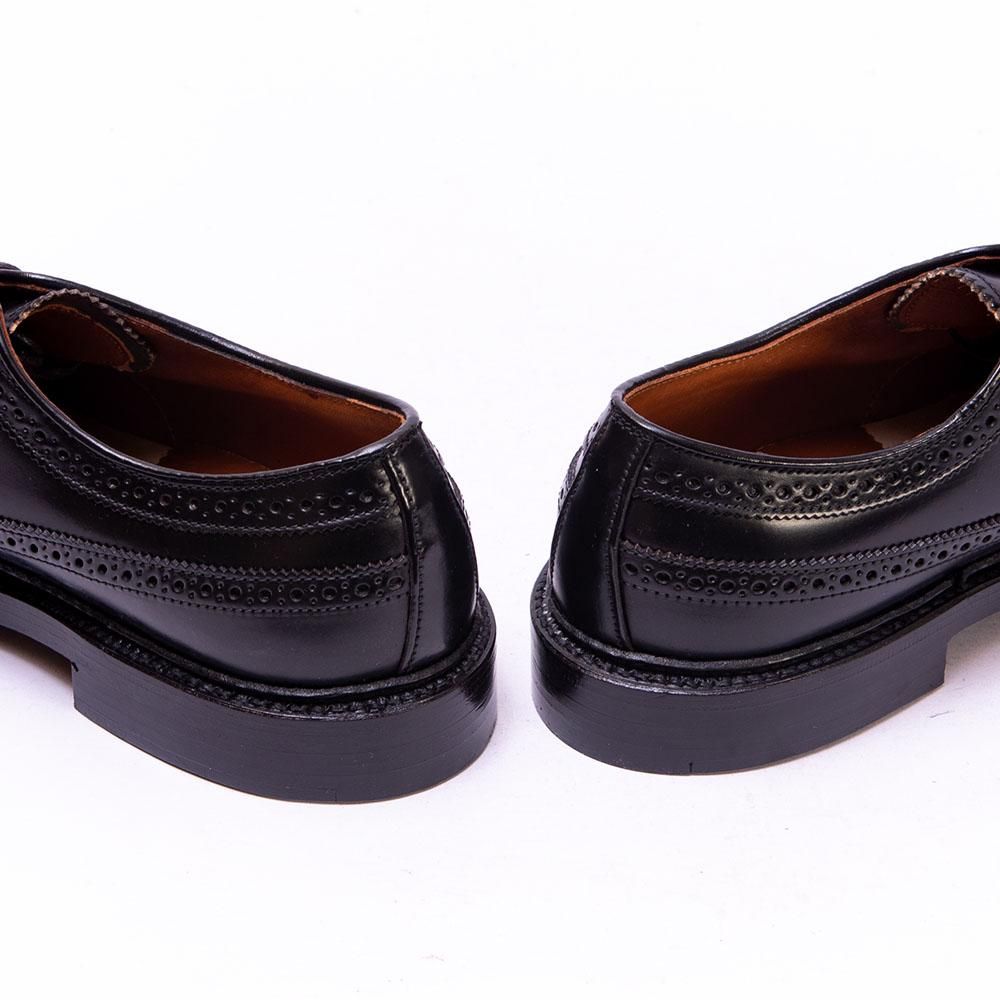 ロングウイングチップのデザインでブラックコードバンを採用した9751は重厚感のあるアイテム。踵周りもしっかりとコバのはったオールラウンドグッドイヤーウェルト製法はバンパーの役割も果たしてしっかりと足を保護しています。