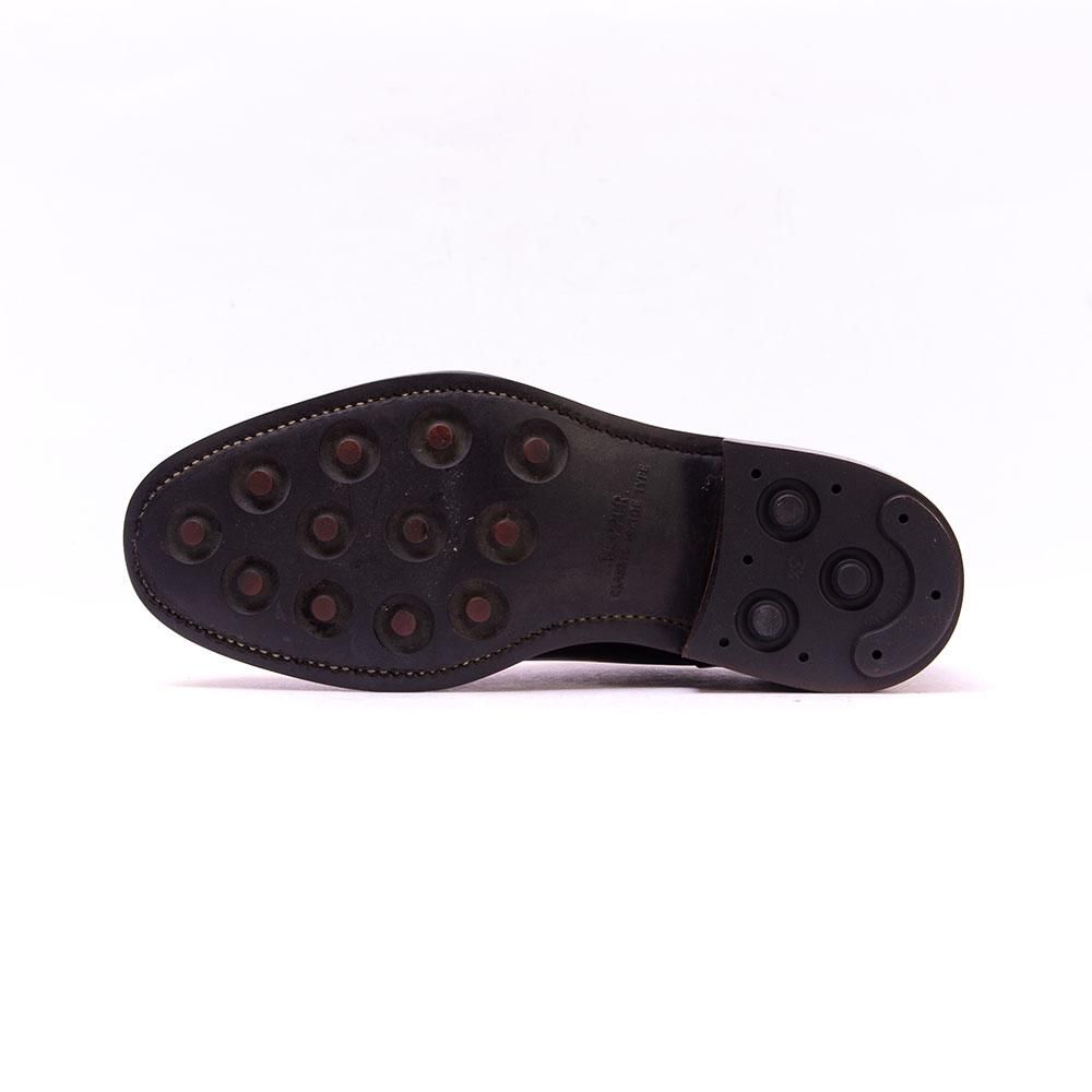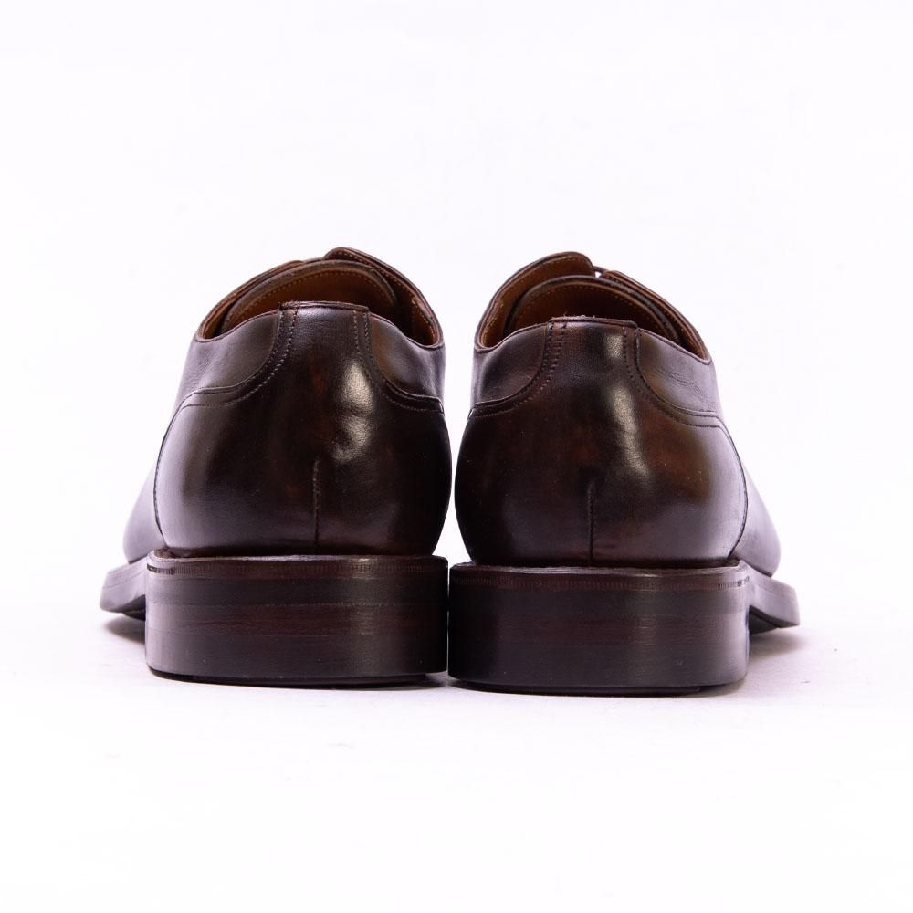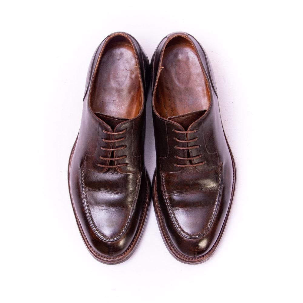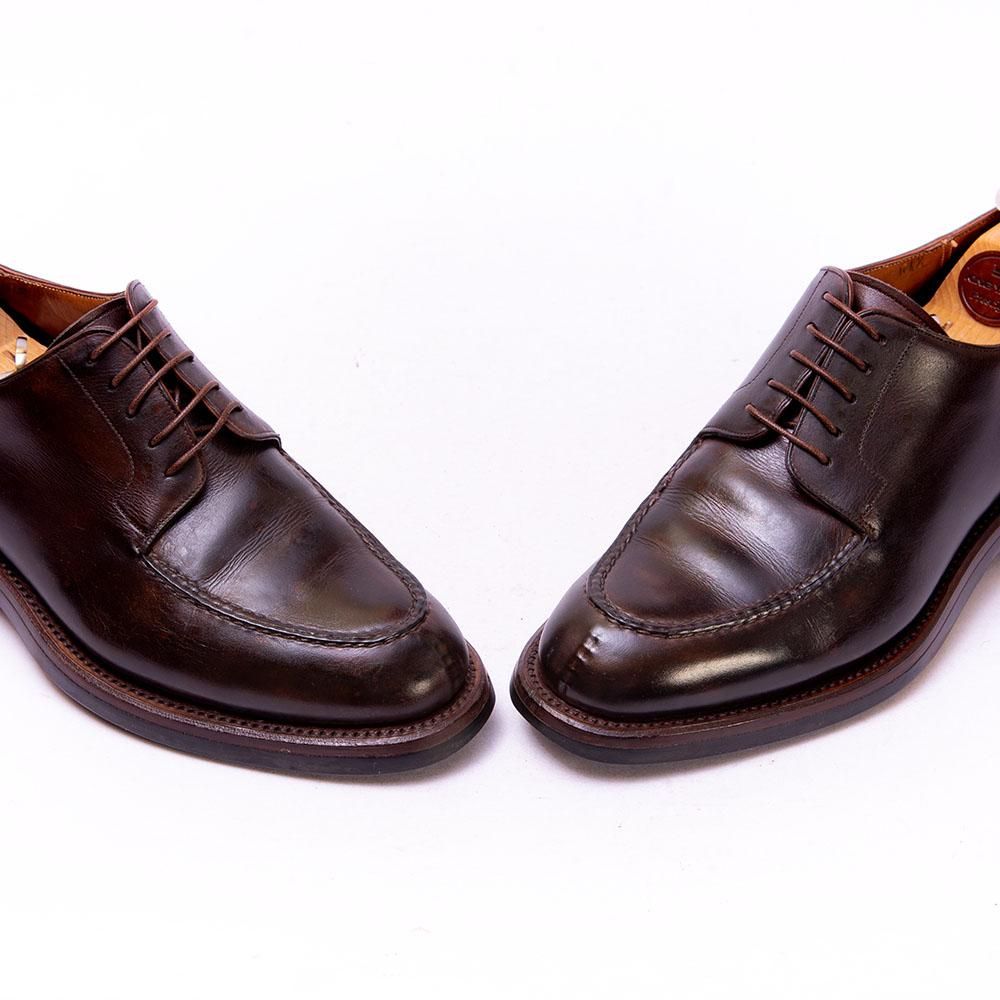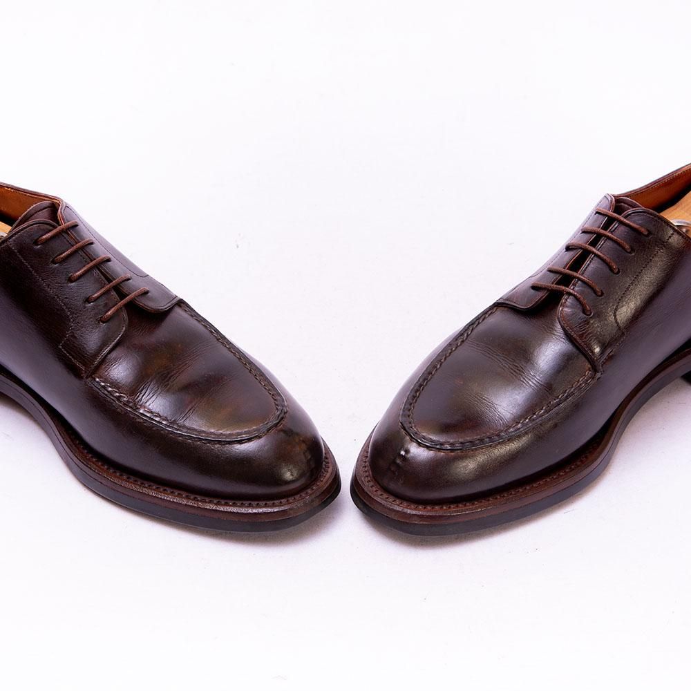 エドワードグリーンのドーバーを彷彿とさせるデザインのUチップダービー。爪先はスキンステッチのような凹凸が付けられていますが一枚革のイミテーションとなっています。こちらはムラ感のある染め替えが行われています。
