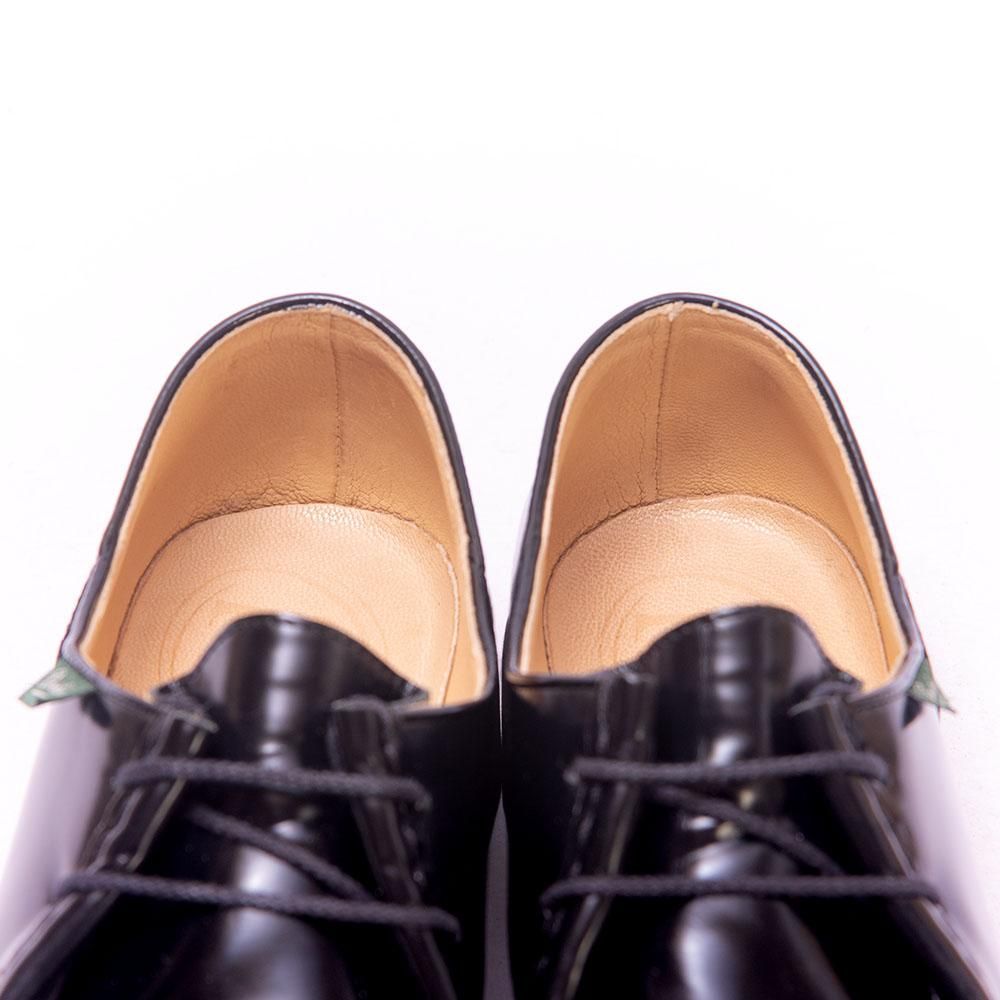 チロリアンシューズを起源としたミカエルは折り返したような2アイレットに大振りなモカでその愛らしい見た目からレディース革靴でも人気のモデル。光沢の強いガラスレザーを使用し定番のリスレザーよりもドレッシーな雰囲気です。