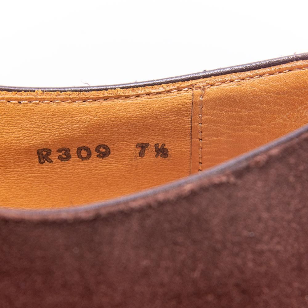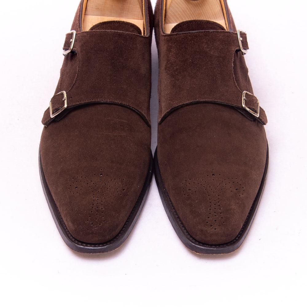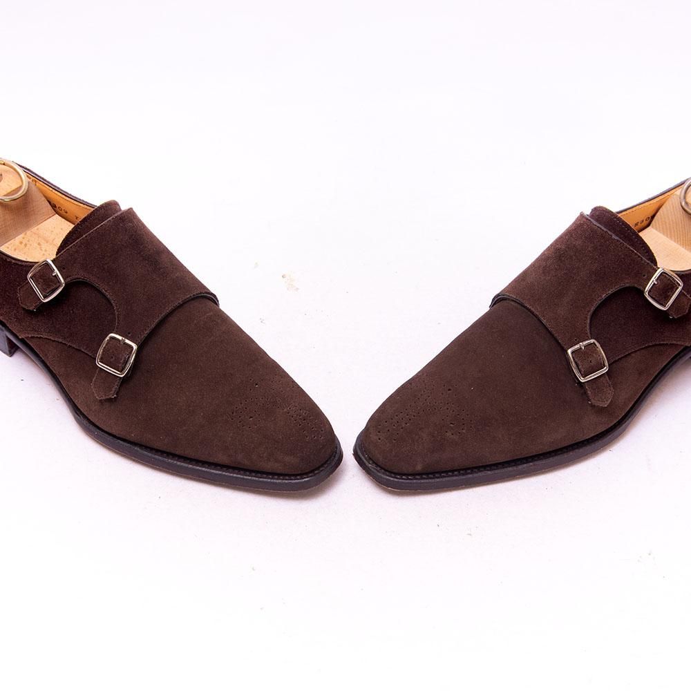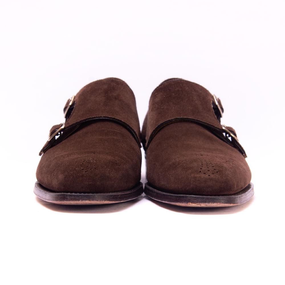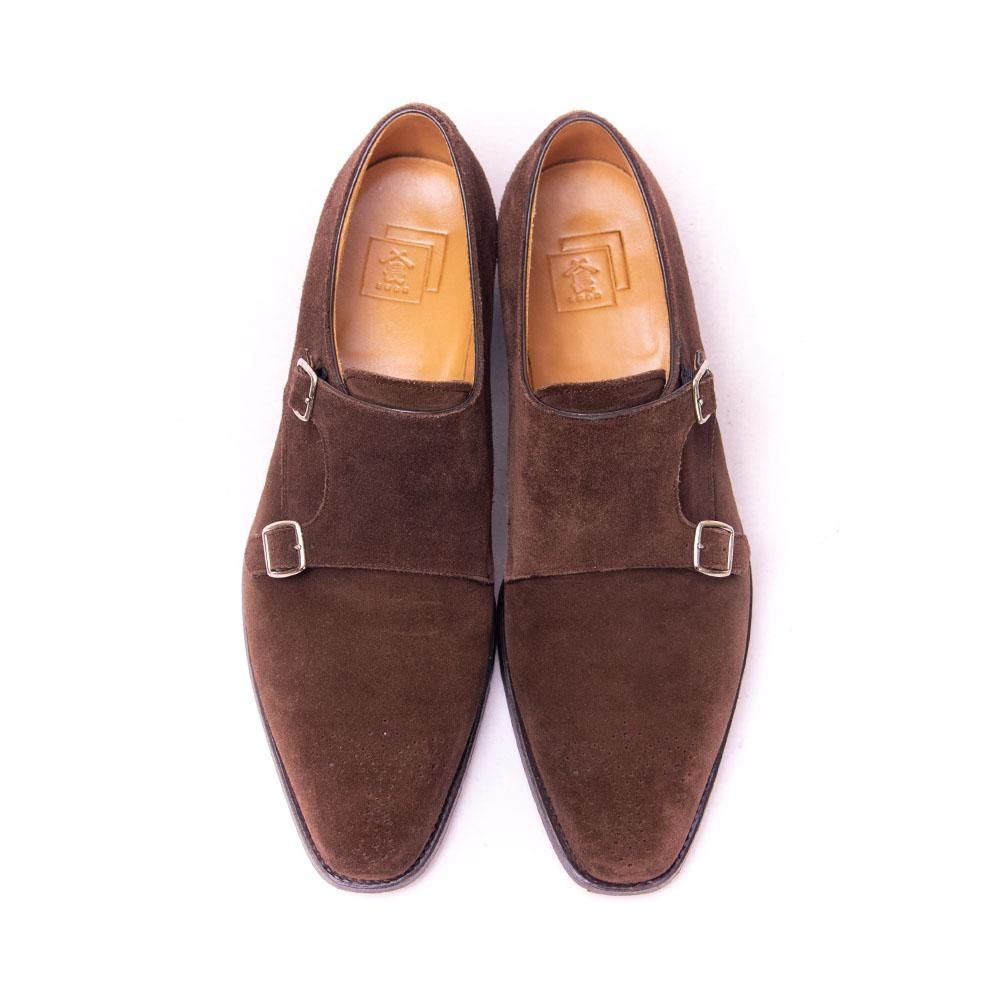 小ぶりのヒールカップに適度なノーズの長さから定番のセミスクエアトゥ木型となるR309を用いたダブルモンクシューズ。スエードの起毛感から控えめの主張となりますがメダリオンがアクセントとなっています、