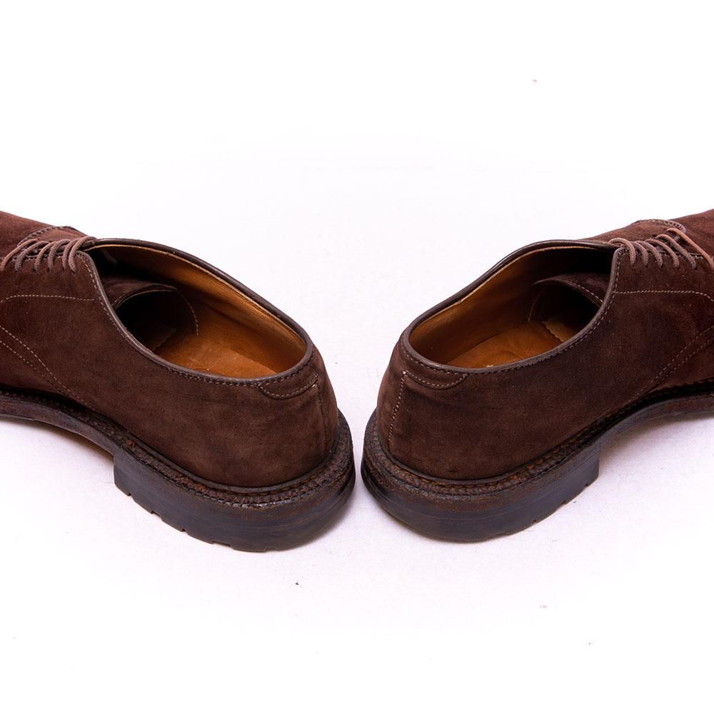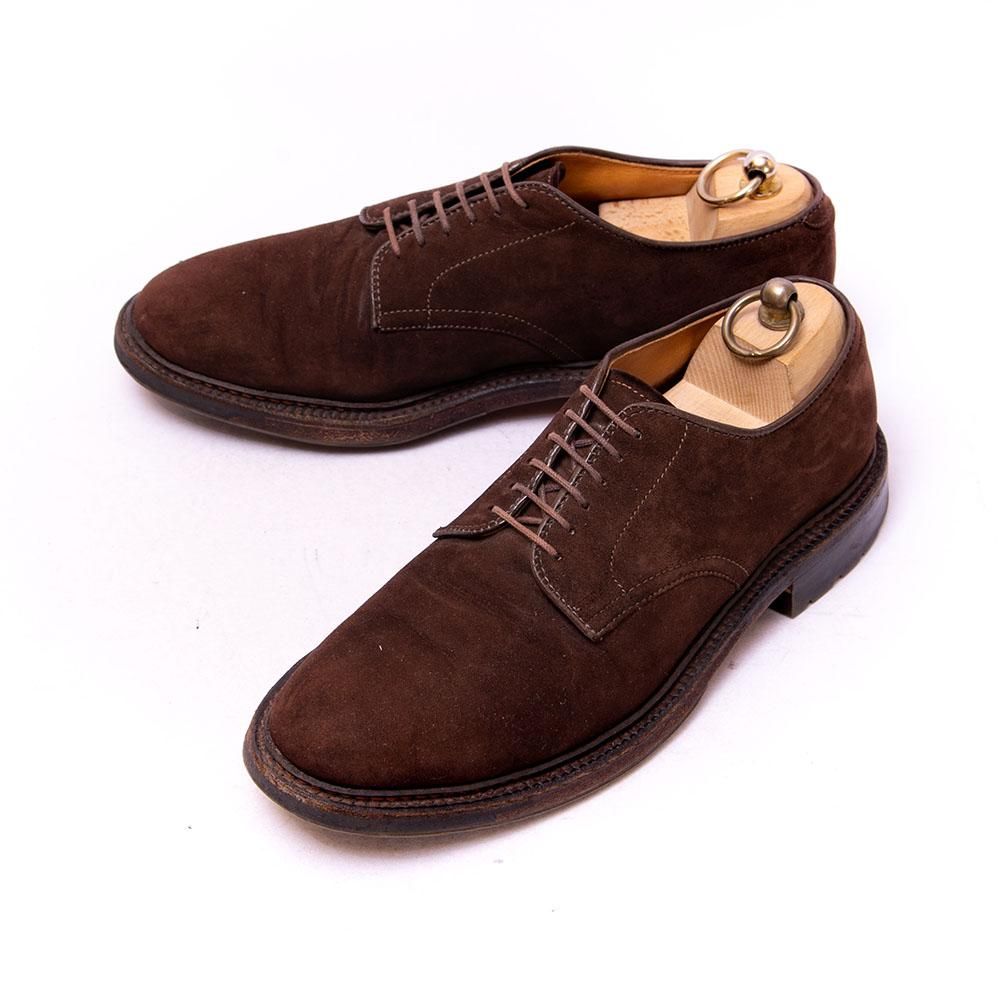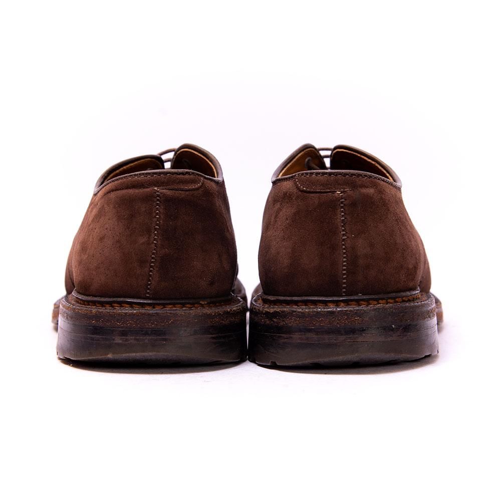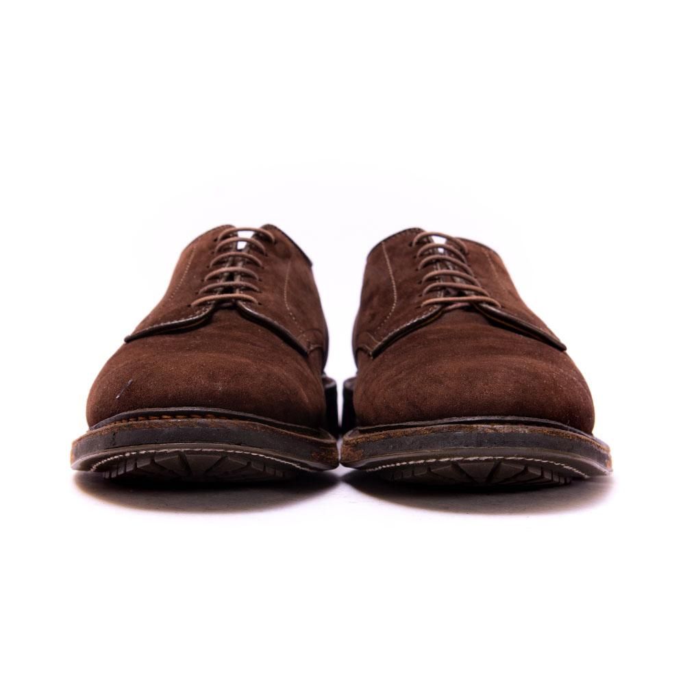 ブラウンスエードにボリューム感のあるプレーントゥで無骨な印象の一足。薄めの溝のハーフコマンドソールで良い塩梅にカジュアルさを足してくれています。こちらは踵の削れがございますが中底の沈みは少々で履き慣らしやすい状態です。