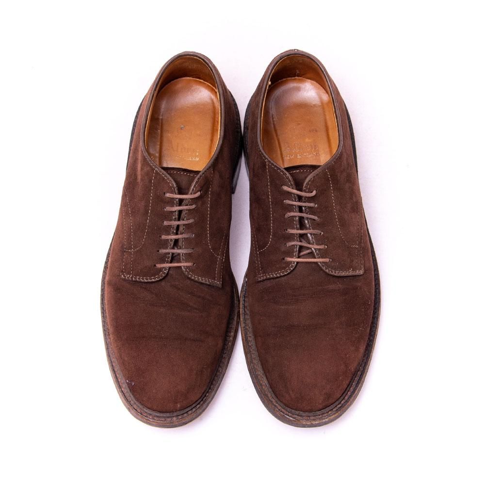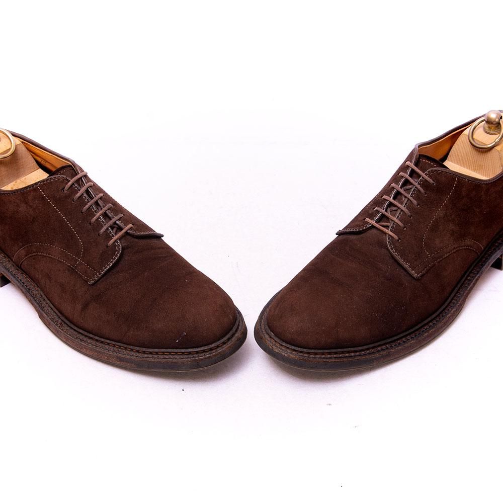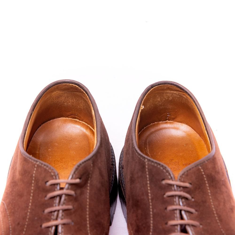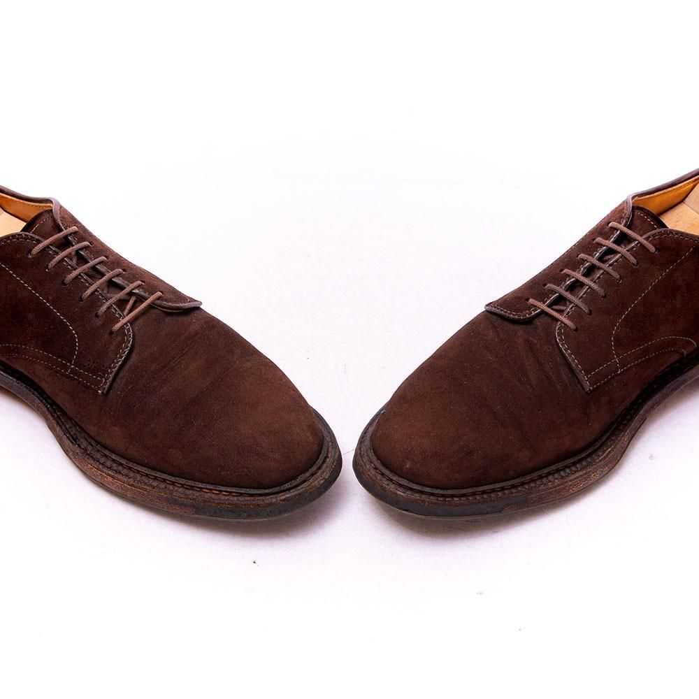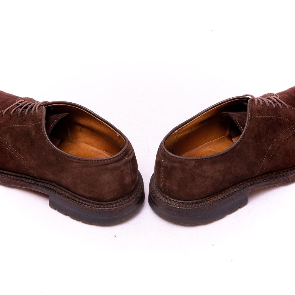 ブラウンスエードにボリューム感のあるプレーントゥで無骨な印象の一足。薄めの溝のハーフコマンドソールで良い塩梅にカジュアルさを足してくれています。こちらは踵の削れがございますが中底の沈みは少々で履き慣らしやすい状態です。
