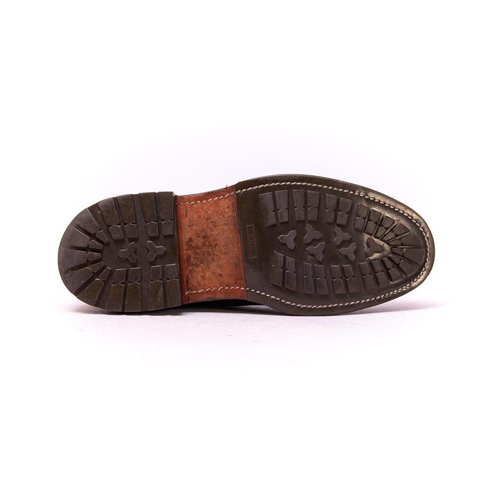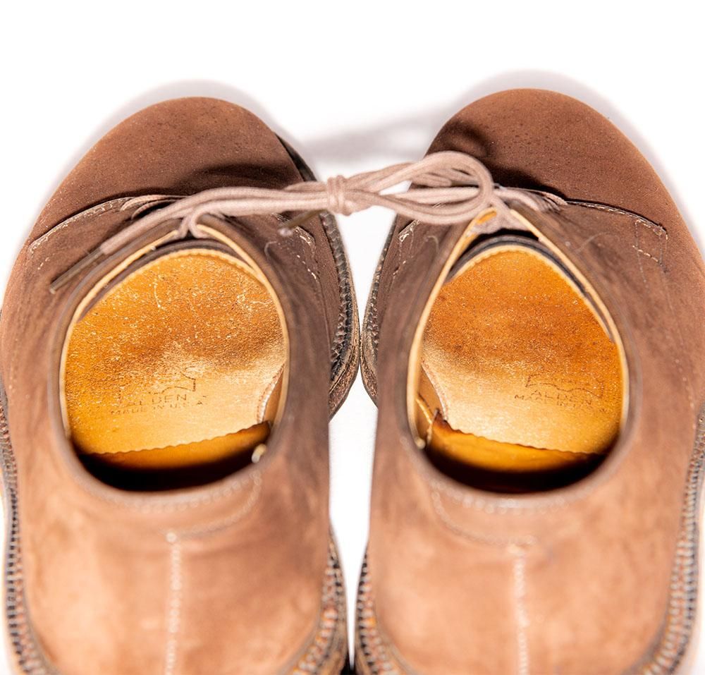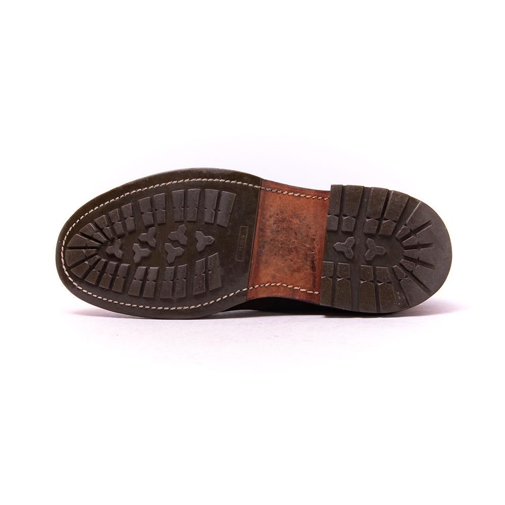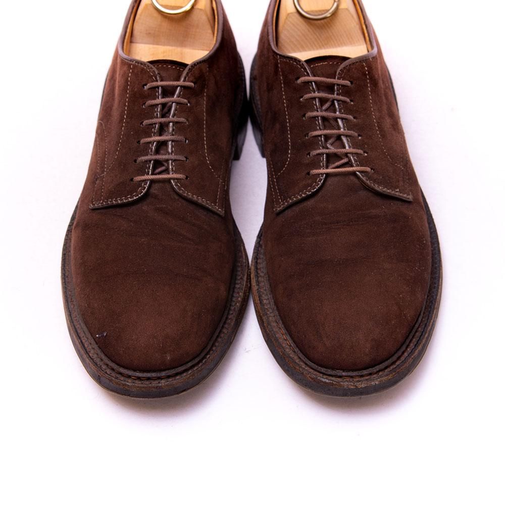 ブラウンスエードにボリューム感のあるプレーントゥで無骨な印象の一足。薄めの溝のハーフコマンドソールで良い塩梅にカジュアルさを足してくれています。こちらは踵の削れがございますが中底の沈みは少々で履き慣らしやすい状態です。
