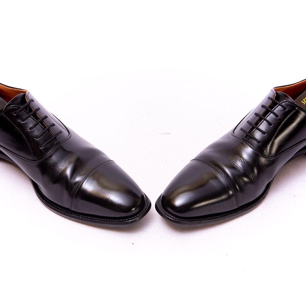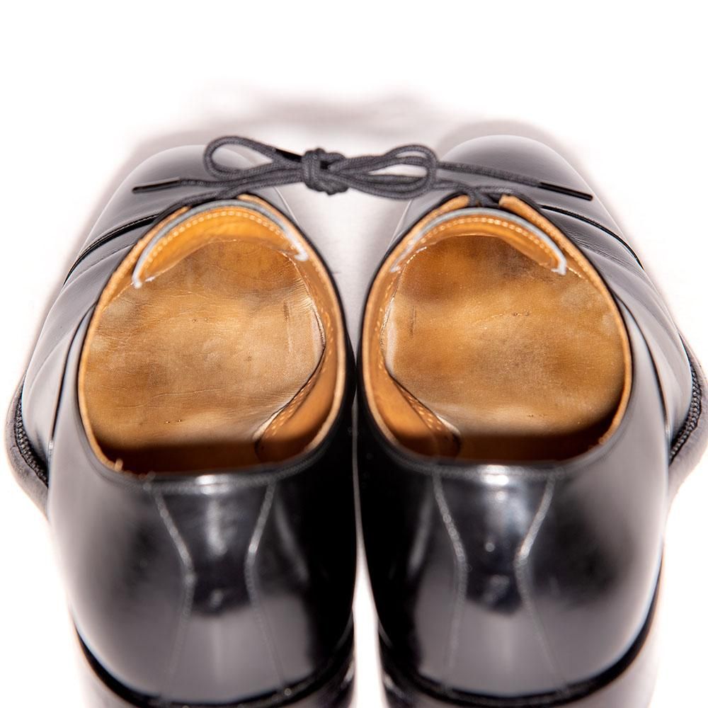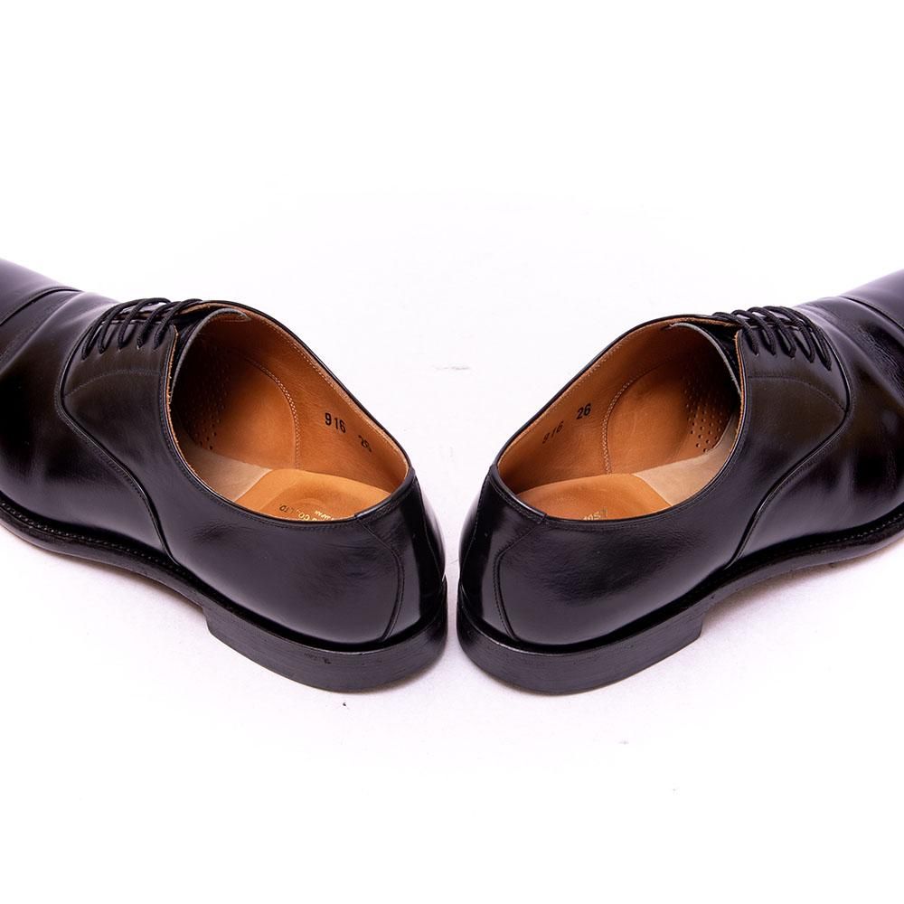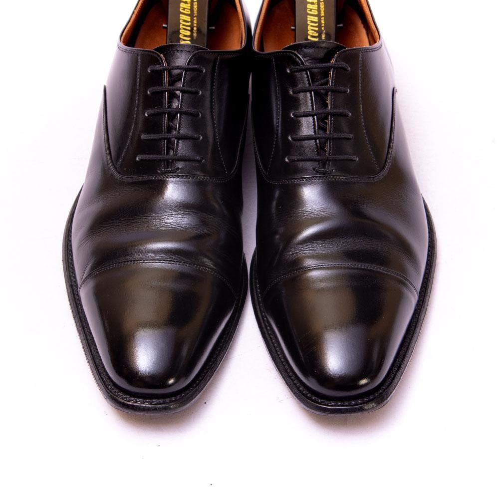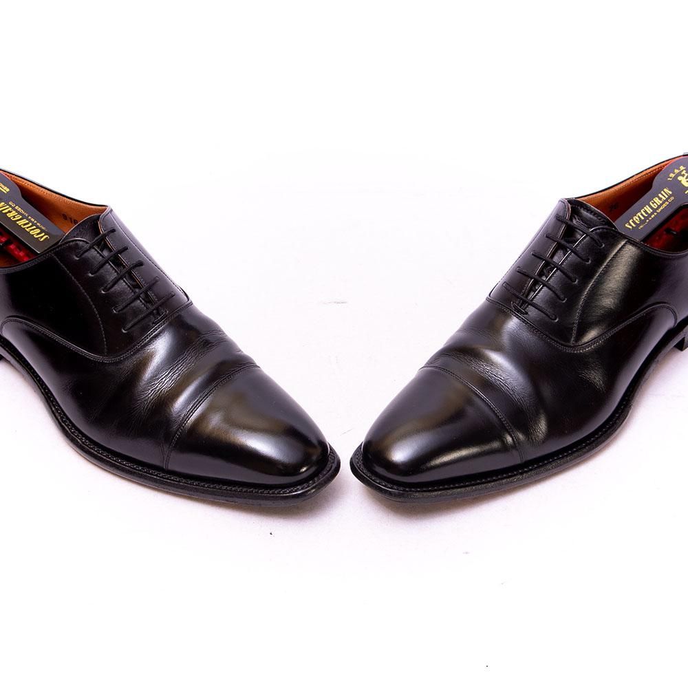日本のビジネスシーンでの人気の高いスコッチグレインを代表する916のオデッサ。スマートなフォルムのブラックのストレートチップで一足あると便利です。中底の沈みやリフトは少々ございますが特にダメージや不具合などないお品です。