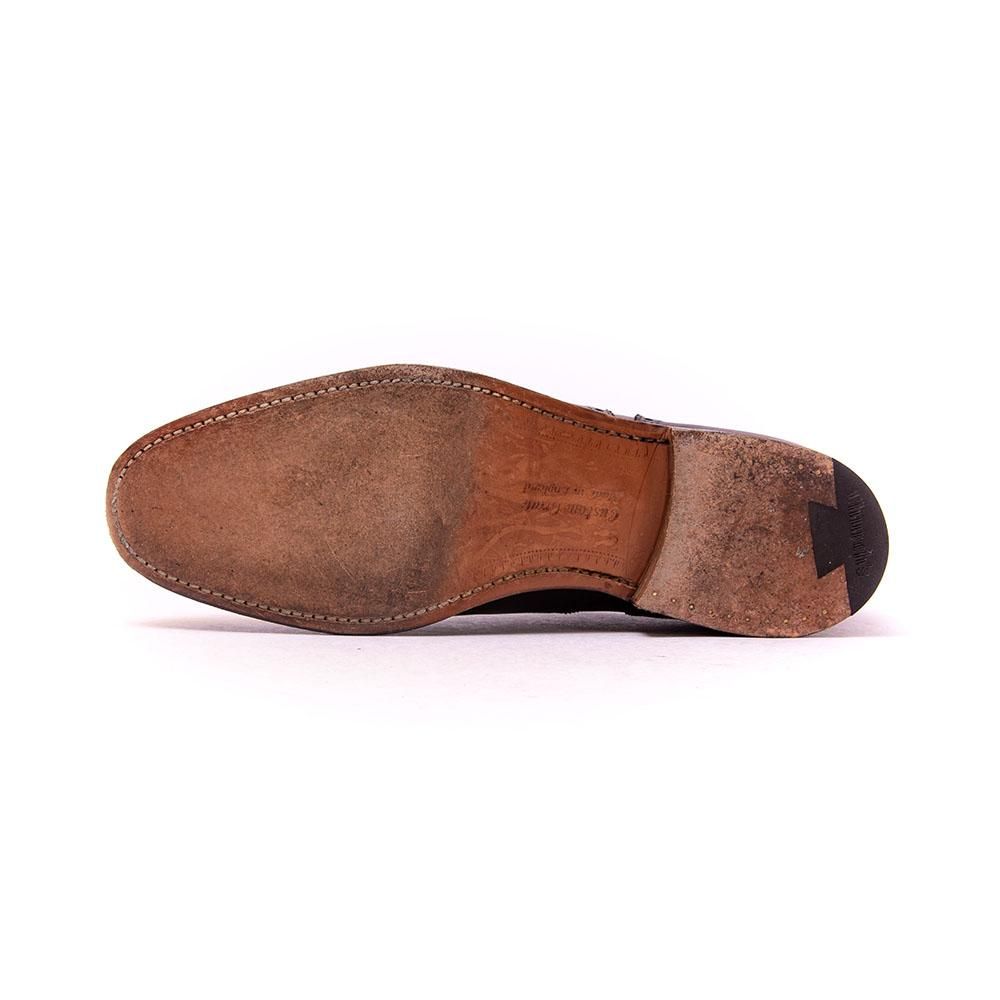 チャーチ定番のディプロマットはブリティッシュトラッドなセミブローグシューズ。エボニーカラーのネバダカーフのくすんだヴィンテージ感のある雰囲気です。中底土踏まず付近にサイズ調整跡がございますが、使用上問題ない程度となります。