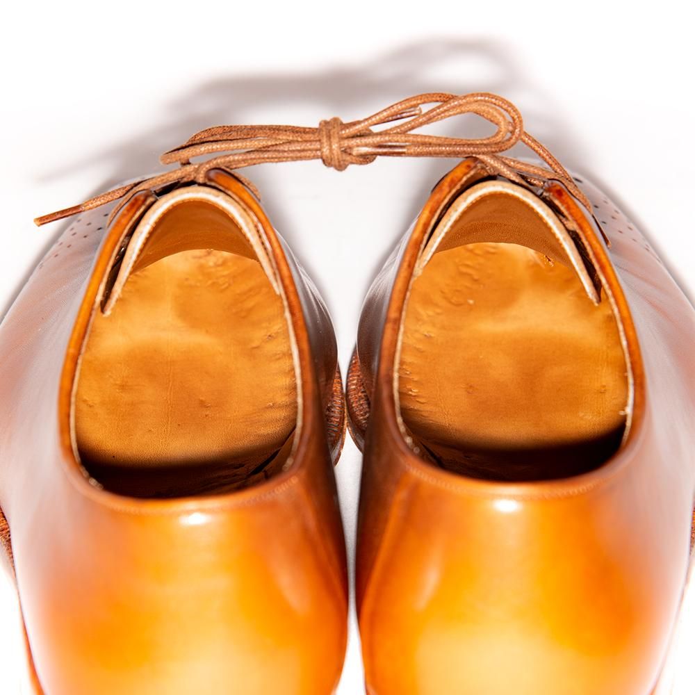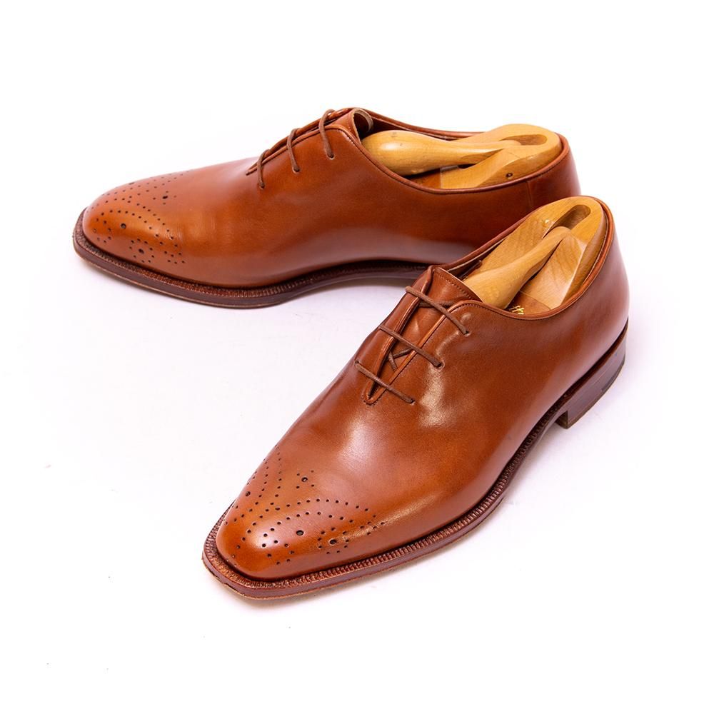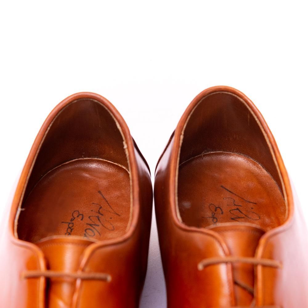 クラシコイタリアを牽引した実力派のシルバノラッタンジのオーダー品のホールカットシューズ。踵の縫いの位置をずらしシームレスヒールのように見せる一工夫感じます。美しいブラウンにメダリオンのシンプルながらもこだわりを感じられます。