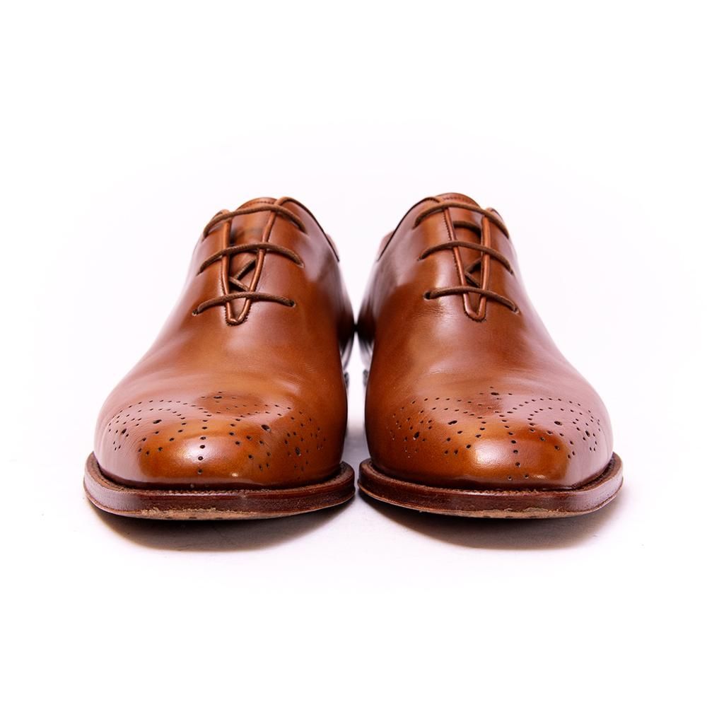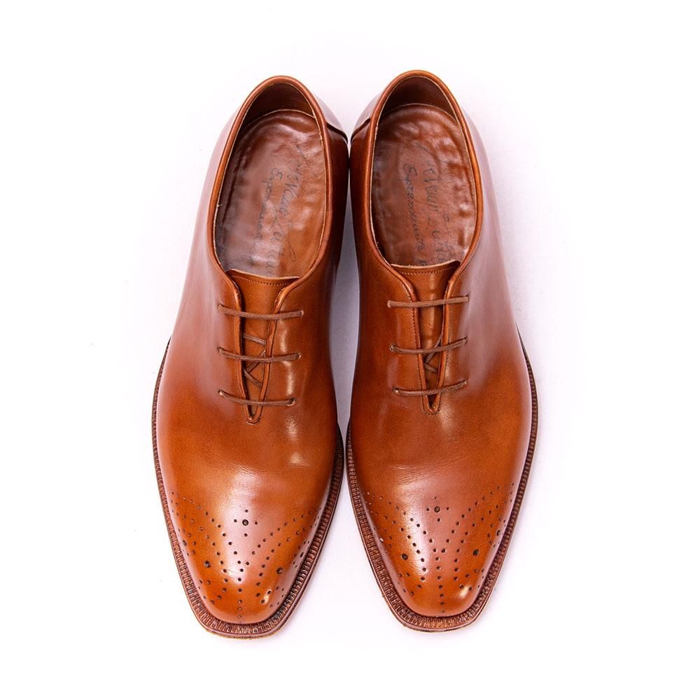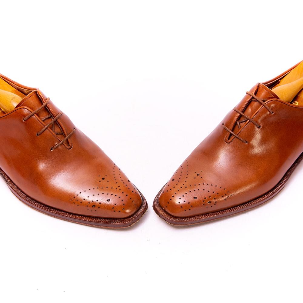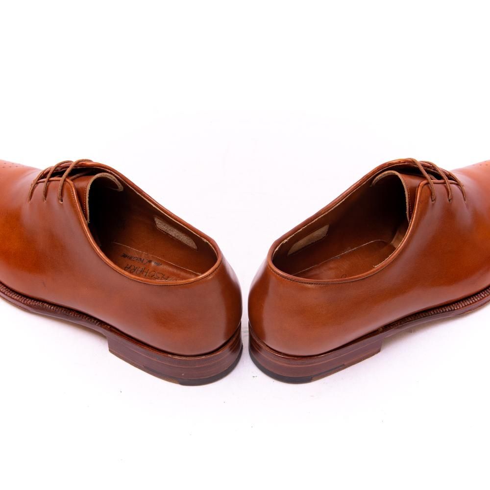 クラシコイタリアを牽引した実力派のシルバノラッタンジのオーダー品のホールカットシューズ。踵の縫いの位置をずらしシームレスヒールのように見せる一工夫感じます。美しいブラウンにメダリオンのシンプルながらもこだわりを感じられます。