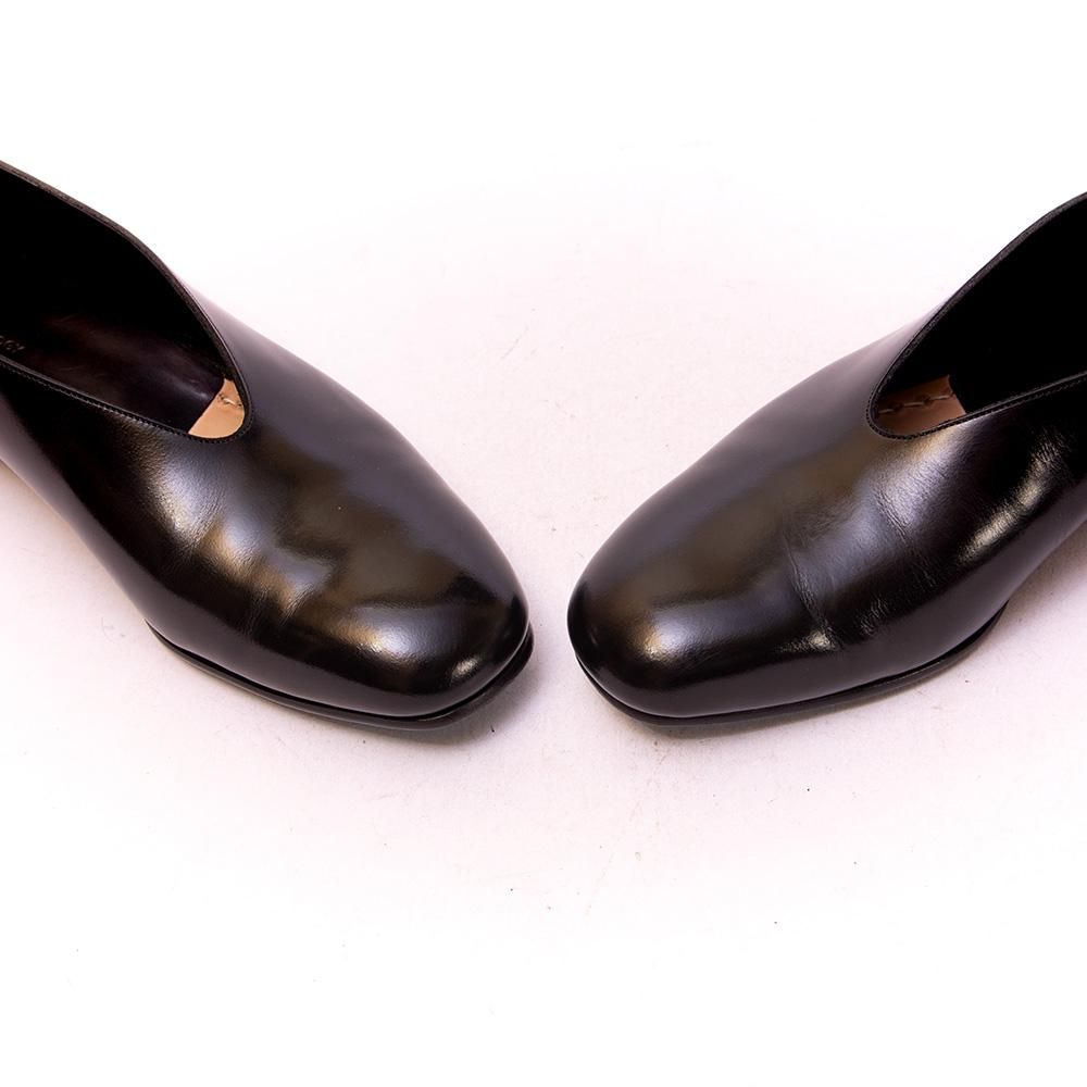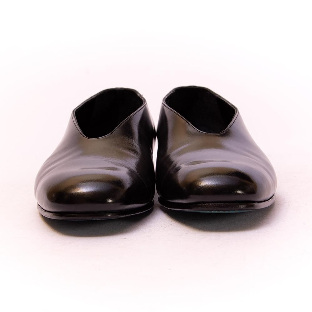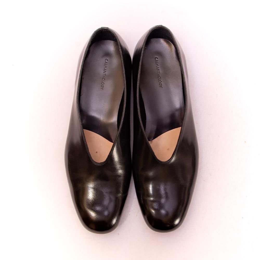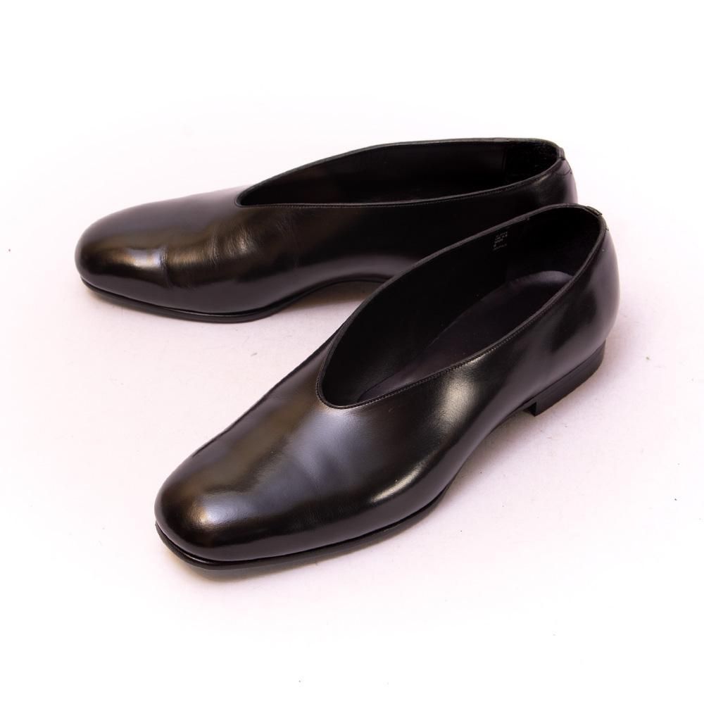 現代的なファッションの革靴を提案するブランドとして支持されるカルマンソロジーのメンズパンプス。こちらの靴のポイントでもあるV字にカットされたデザインがモードかつ中性的でブランドらしさが現れています。