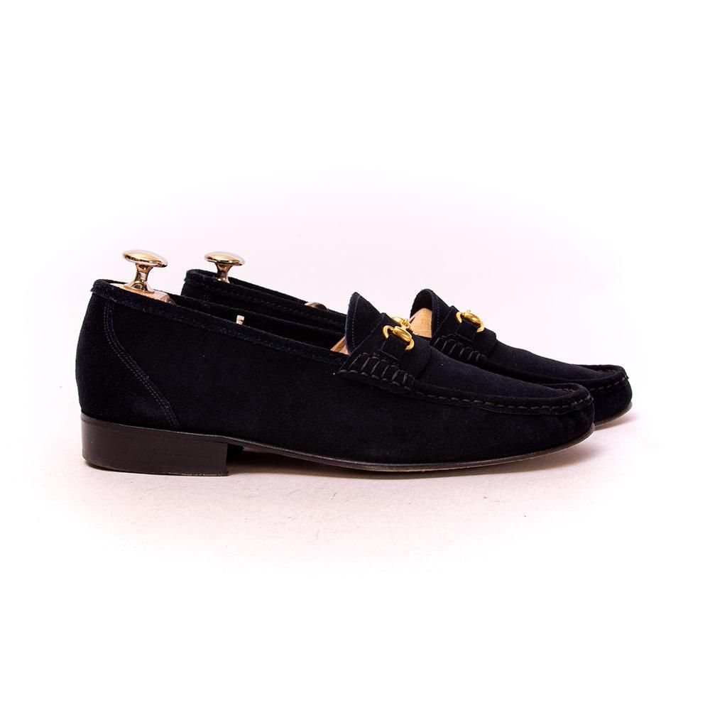 濃紺のスエードと金ビットのコントラストが効いた一足。covertgrayというショップまたはブランド名義のもので詳細は不明ですがキメが細かいスエードの上質さ、小振りなビットなど現代のコーデに溶け込める内容。サイズはUS規格相当となります。
