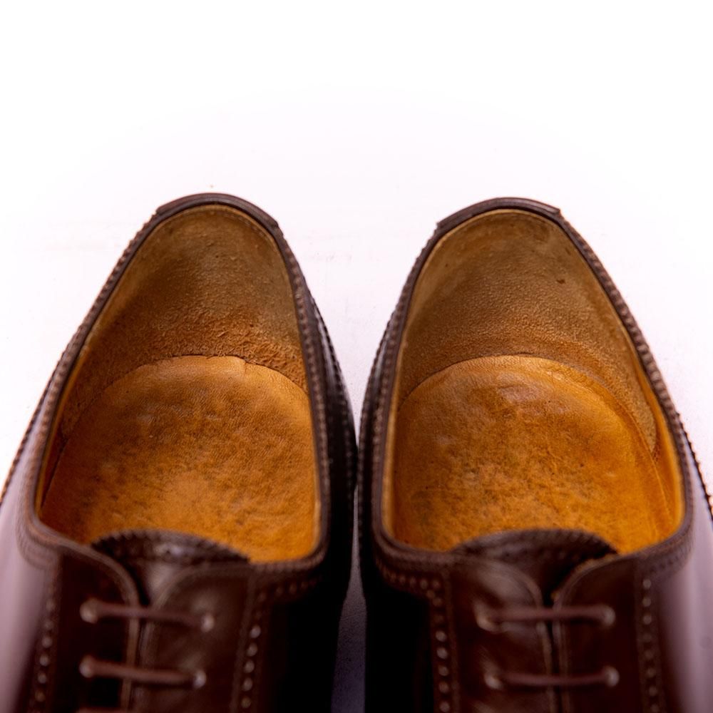 エンツォボナフェらしいセミスクエアトゥの外羽根セミブローグでオンオフ共に活躍してくれるような一足。インソックの全体に経年によるシミが見受けられますが、アッパーやソールの使用感は少ない状態となっています。