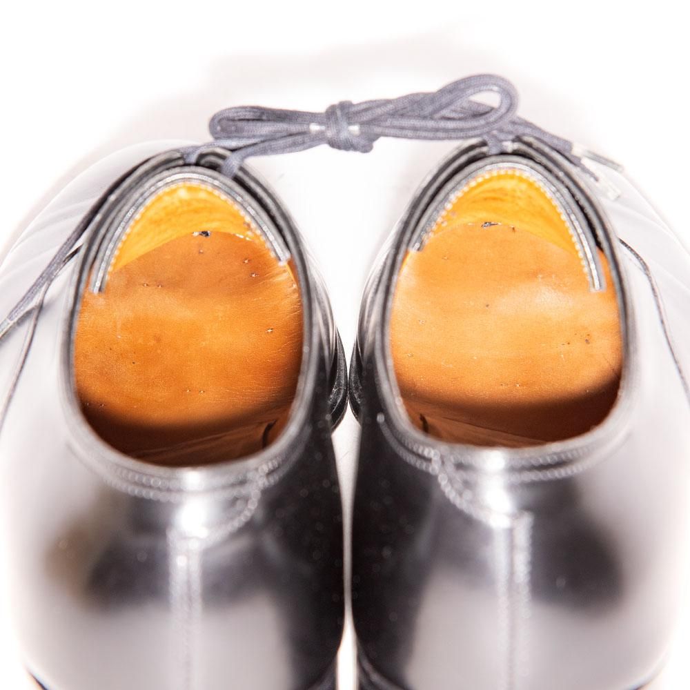 冠婚葬祭にも対応した内羽根プレーントゥはドレス感のあるデザイン。セミヴィンテージのお品になりますが、こちらも肉厚かつ緻密な繊維質で非常に優れたツヤ感をまとっています。使用10回前後のコンディション。