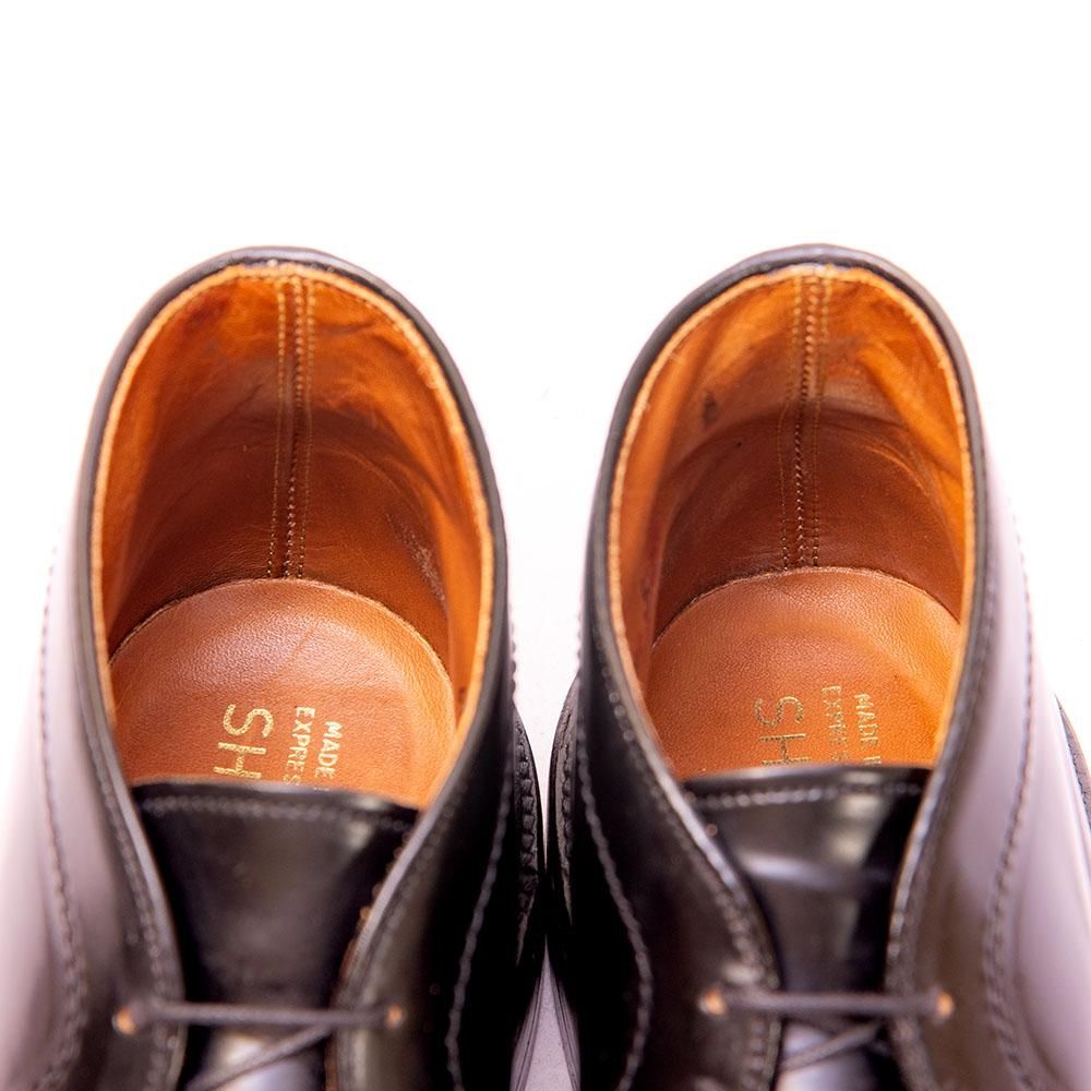 オールデン定番チャッカブーツの1340はブラックコードバンの経年変化が広い面積で楽しめる一足。足型を選ばないバリーラストとミドル丈で安定したフィッティング。こちらはほとんど使用感のない状態となっております。
