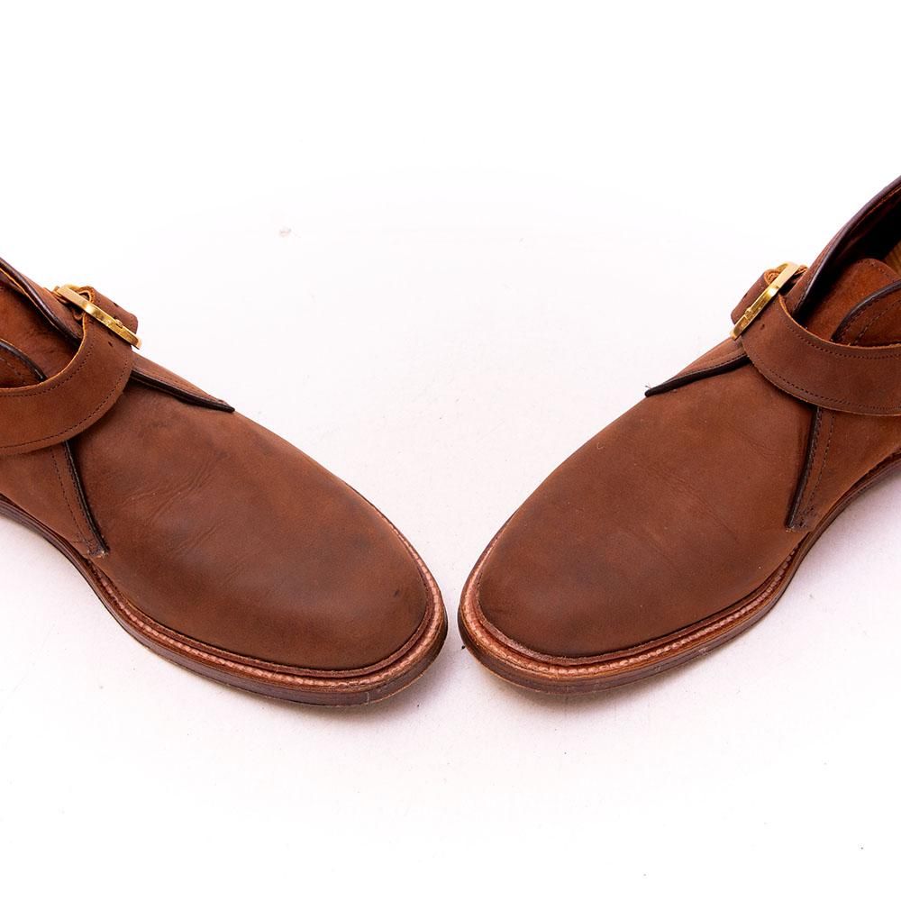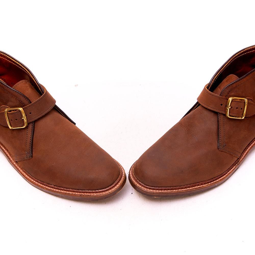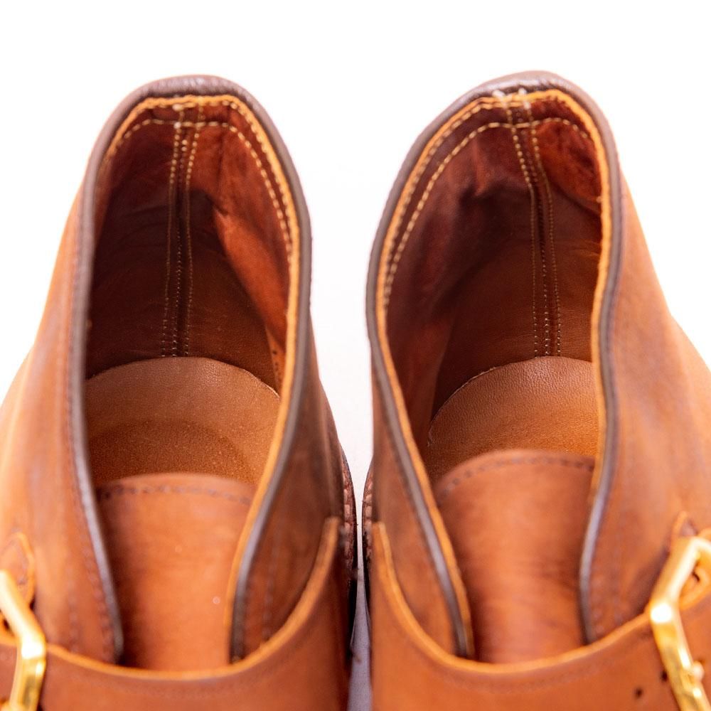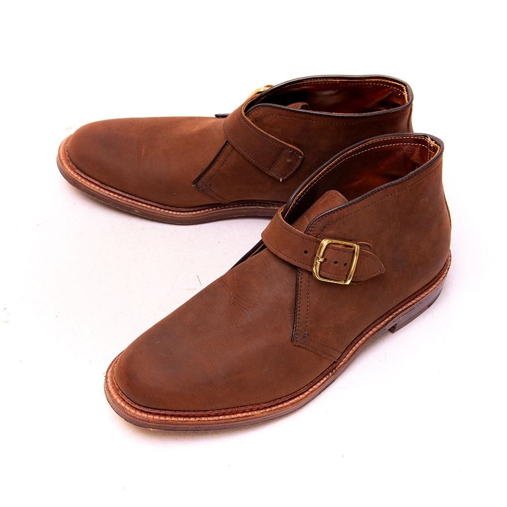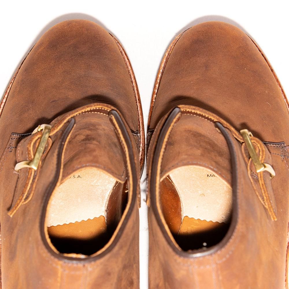 本国ショップ別注らしいオールデンのタバコシャモアを使用したジョージブーツ。水にも強く耐久性に富んだ素材でガシガシ着用できます。定番のミドル丈にストラップが施され硬派な雰囲気を感じます。