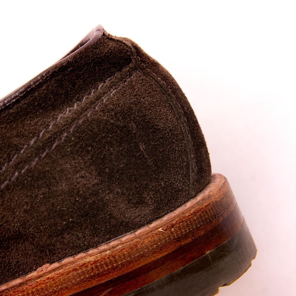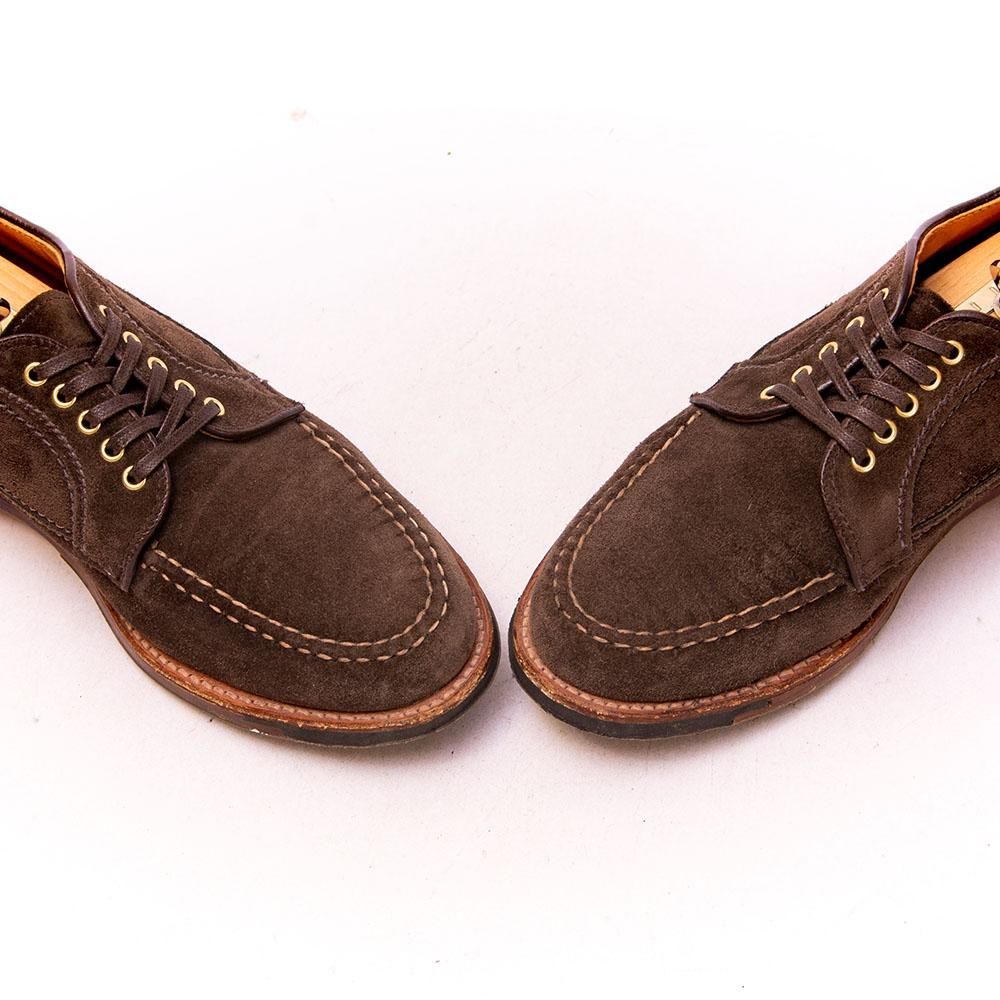 密かな名作として人気のレンジャーモックにくすんだローデングリーンのスエードで大人なカントリーテイストを感じます。右足の踵部分に切り傷がございますが芯材の部分のため支障のなく着用いただけます。