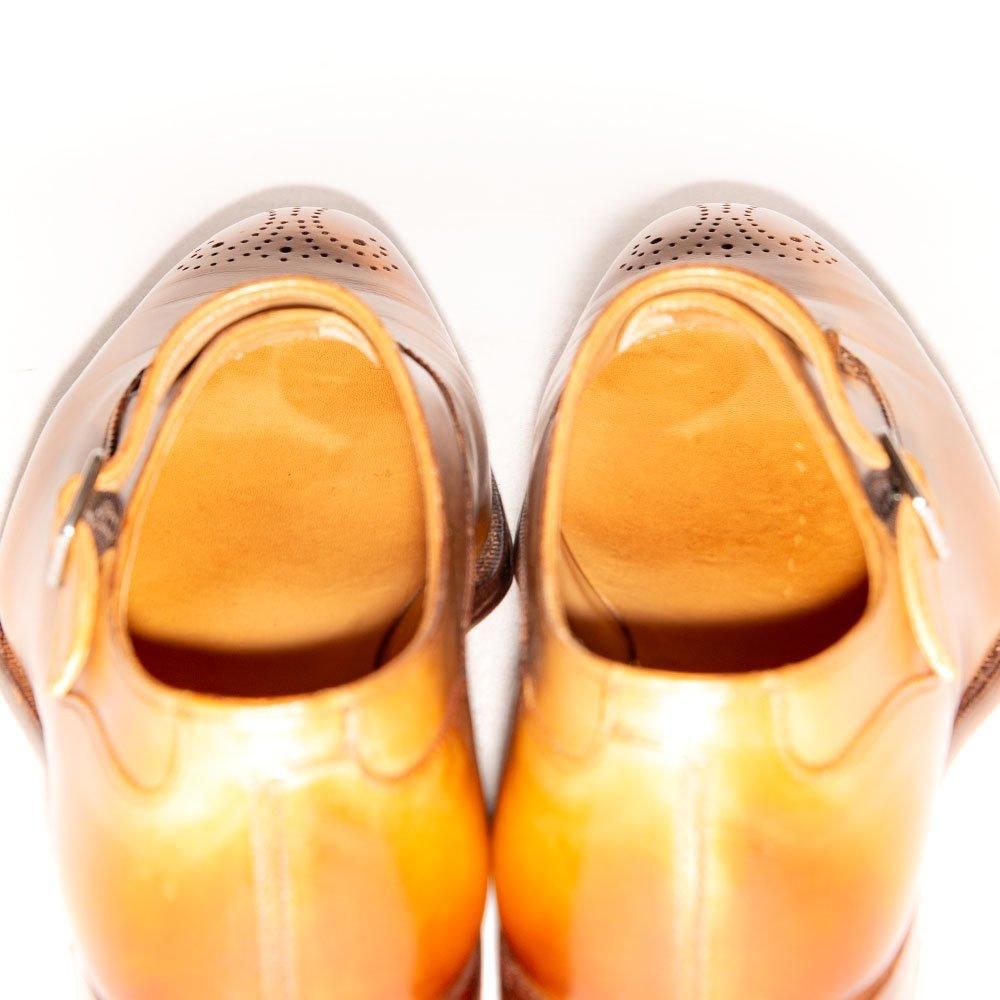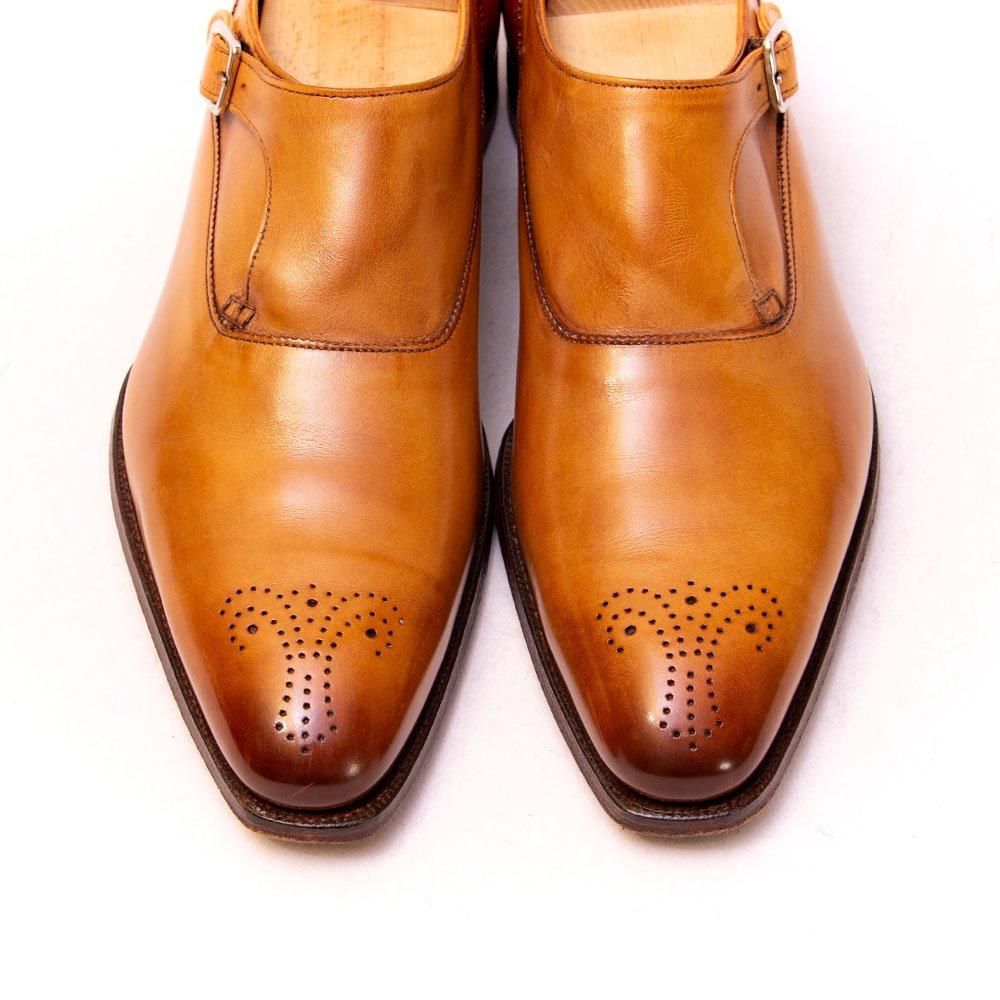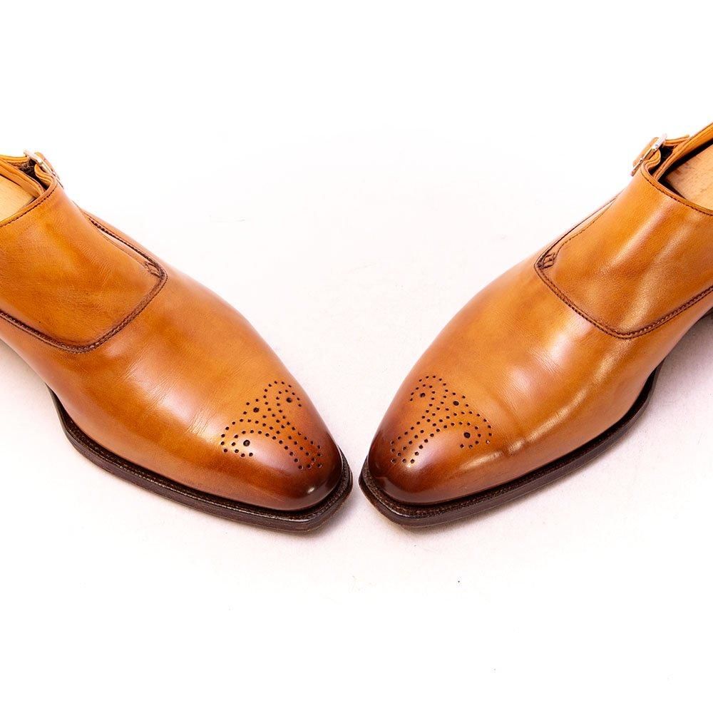 ハンドグレードコレクションらしいロングノーズのチゼルトゥのサイドモンクストラップとドレス感が魅力の一足。発色の良い鮮やかなライトブラウンカラーにメダリオンがアクセントになっています。