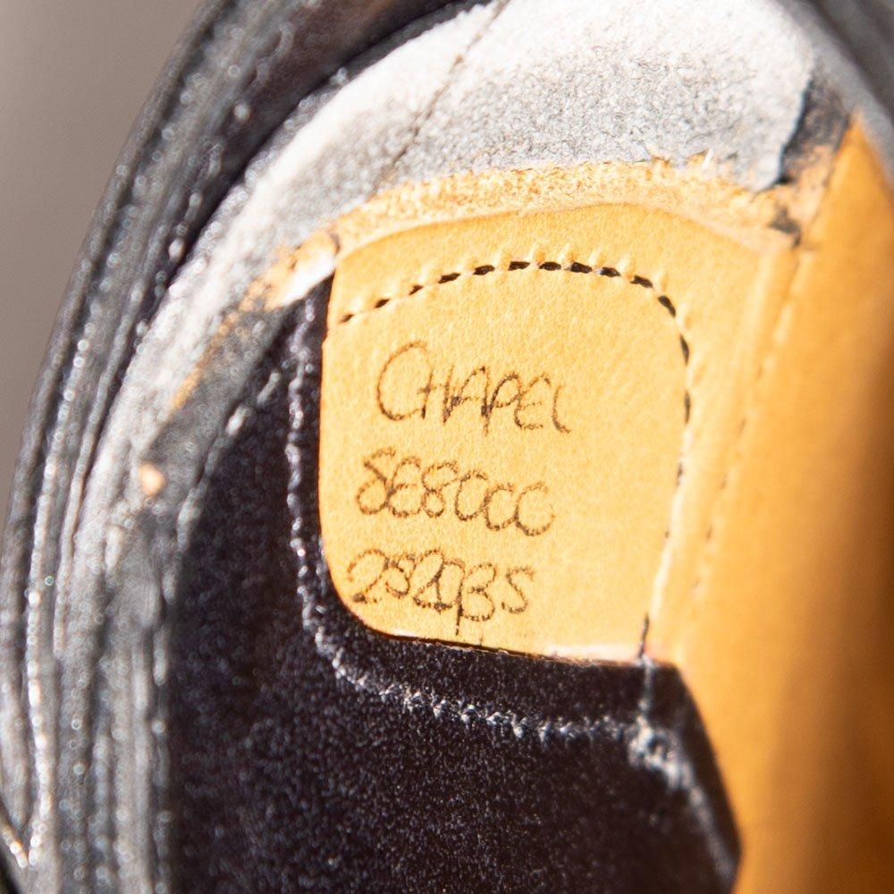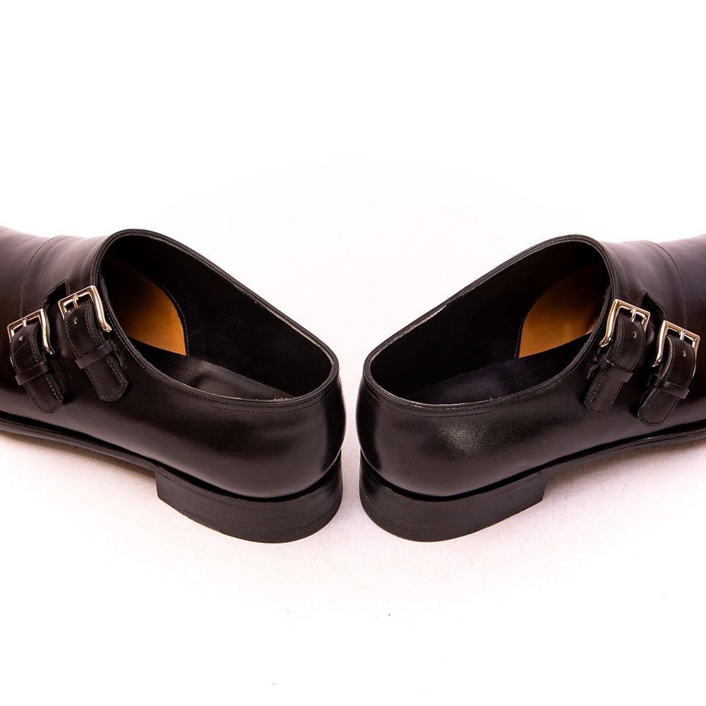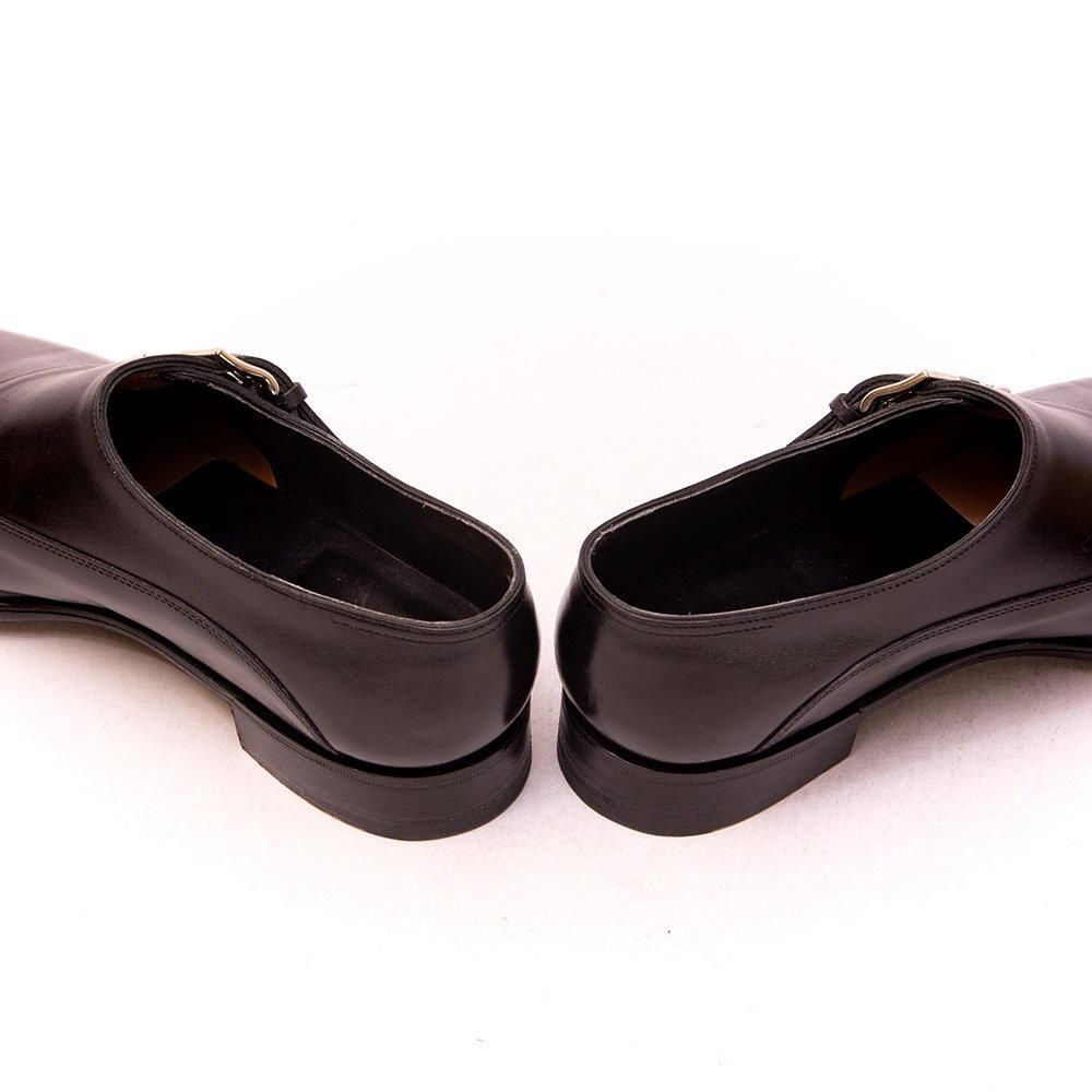 平行に並んだ斜め後方に走るストラップとややロングノーズのセミスクエアトゥ8000ラストのエレガントなダブルモンクのチャペル。きめの細かいブラックのカーフと凛々しく光るシルバーバックルがストイックな雰囲気です。
