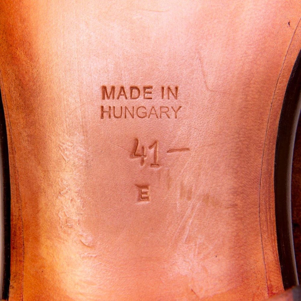 ハンガリーにてハンドソーンウェルテッド製法を主とするシューメーカーのヴァーシュ。ソリッドなスクエアトゥでイタリア靴らしさも感じられます。スリーピースシューツリー付属。トップリフトに加水が見られ一部欠けが見られます。