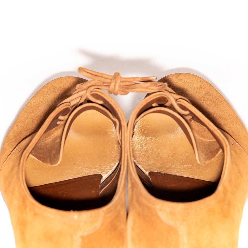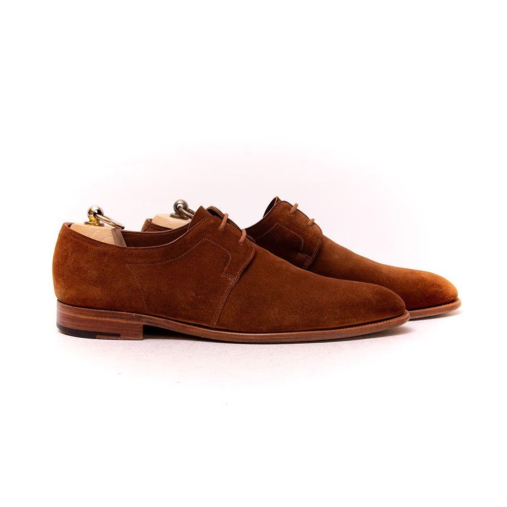 2アイレットのプレーントゥに羽根部分に特徴的なステッチデザインが現代的な雰囲気の一足。ブラウンスエードにナチュラルコバと軽やかなスタイリングにおすすめです。リフトや中底の沈みは少なくこれから長く愛用できます。