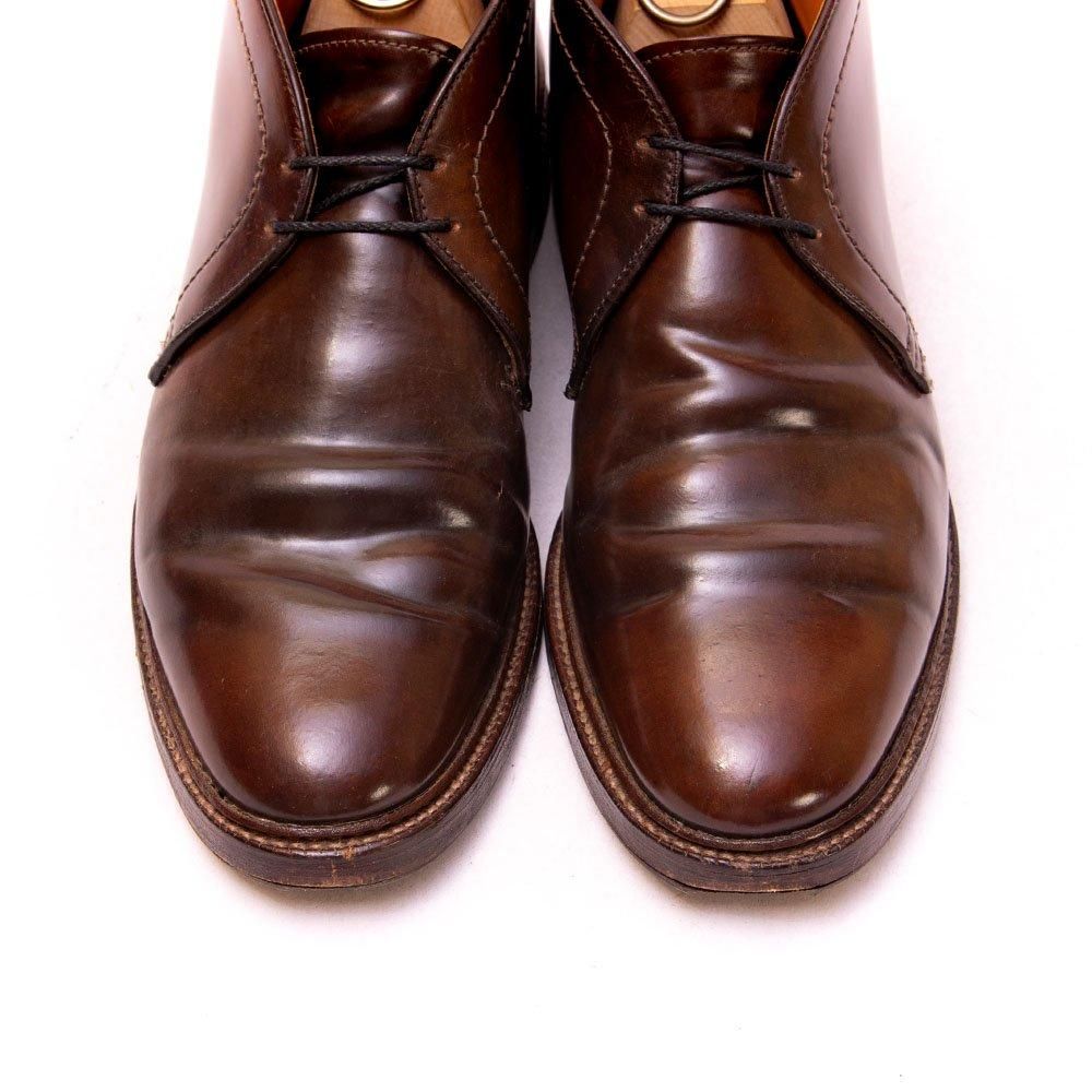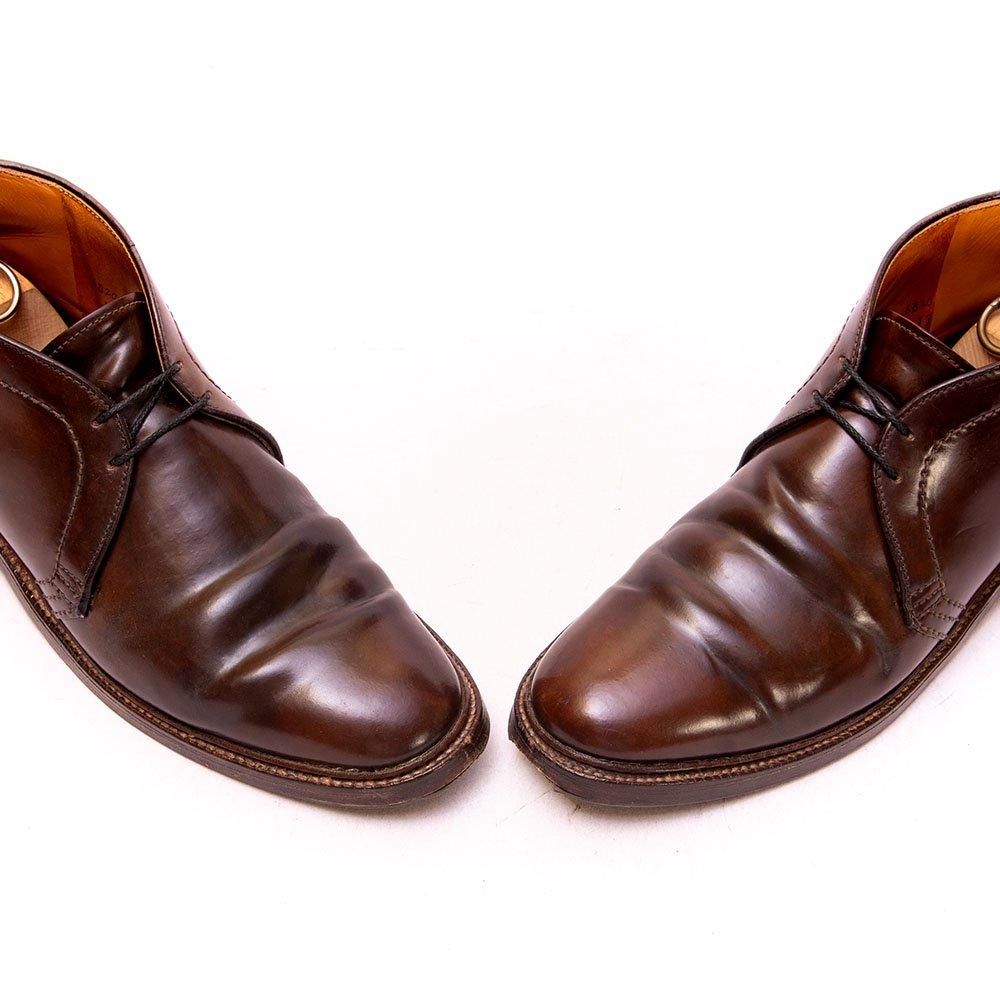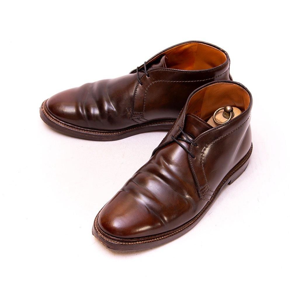 オールデンのコードバンの中でもレアカラーのシガーカラーのチャッカブーツ。落ち着いたダークブラウンの色合いにエイジングした個体です。こちらは補修ステッチ跡とクラックなど状態考慮でお値段を抑えて販売しております。