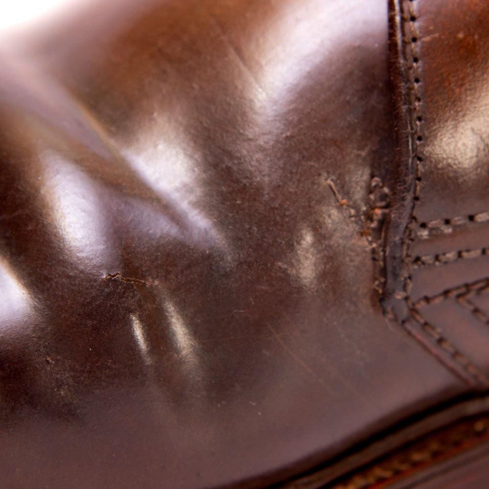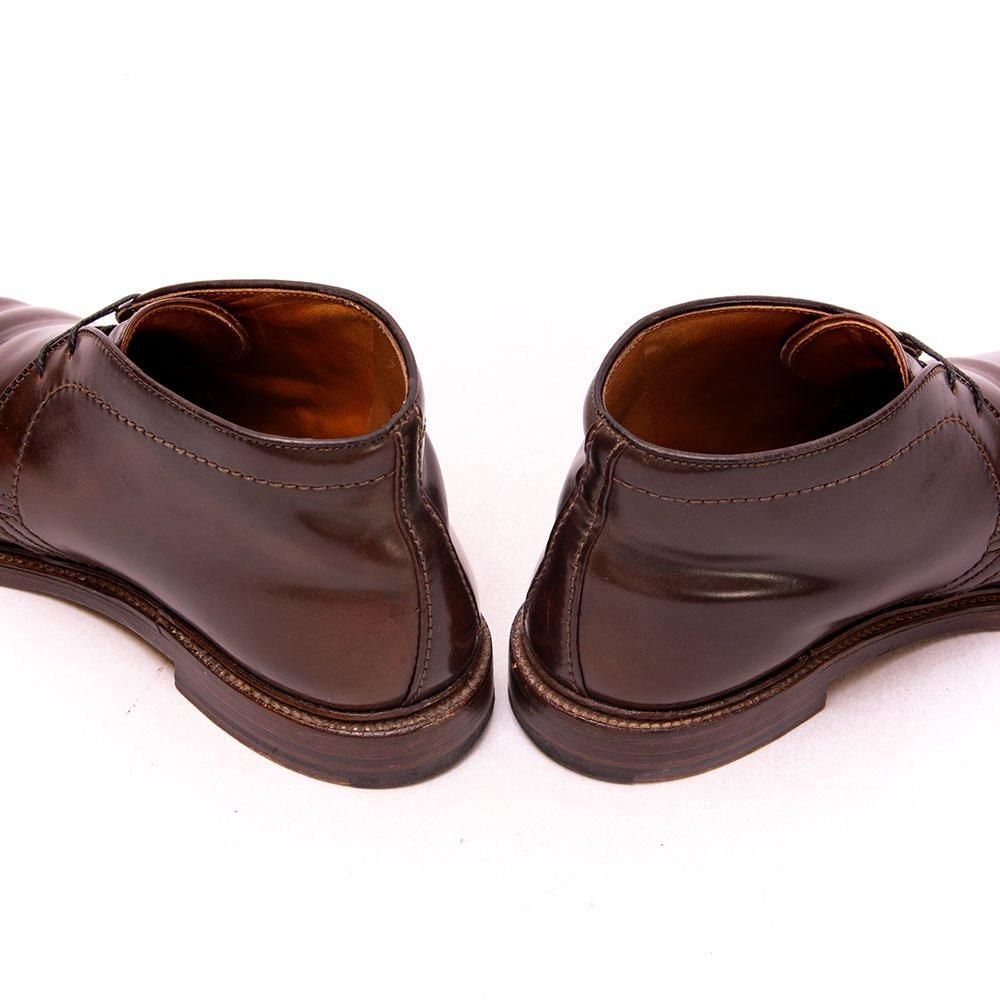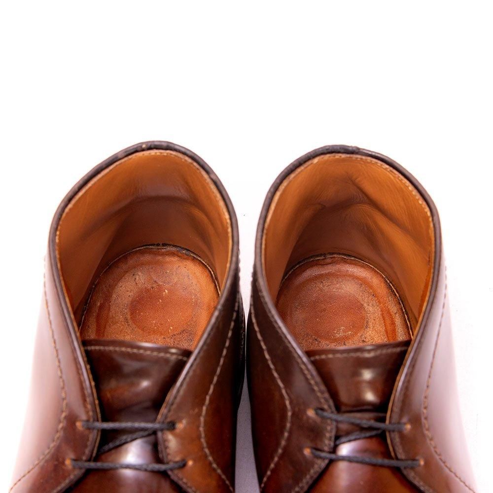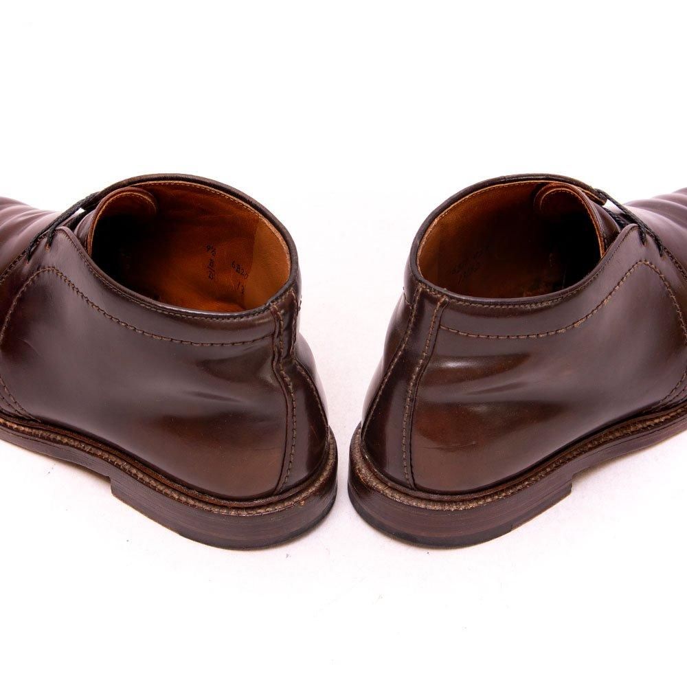 オールデンのコードバンの中でもレアカラーのシガーカラーのチャッカブーツ。落ち着いたダークブラウンの色合いにエイジングした個体です。こちらは補修ステッチ跡とクラックなど状態考慮でお値段を抑えて販売しております。