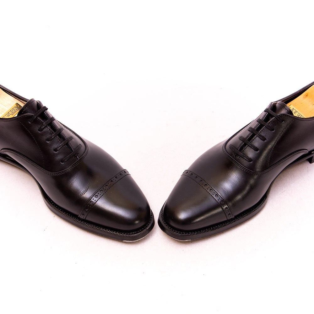 浅草にて製造を行うジョーワークスは日本人にも合う木型で履き心地に定評のあるシューメーカー。美しいフォルムデザインのパンチドキャップでドレスシーンにおすすめです。着用回数ごく僅かなコンディション。