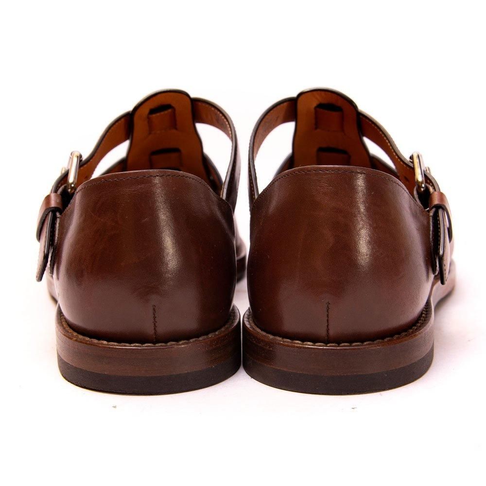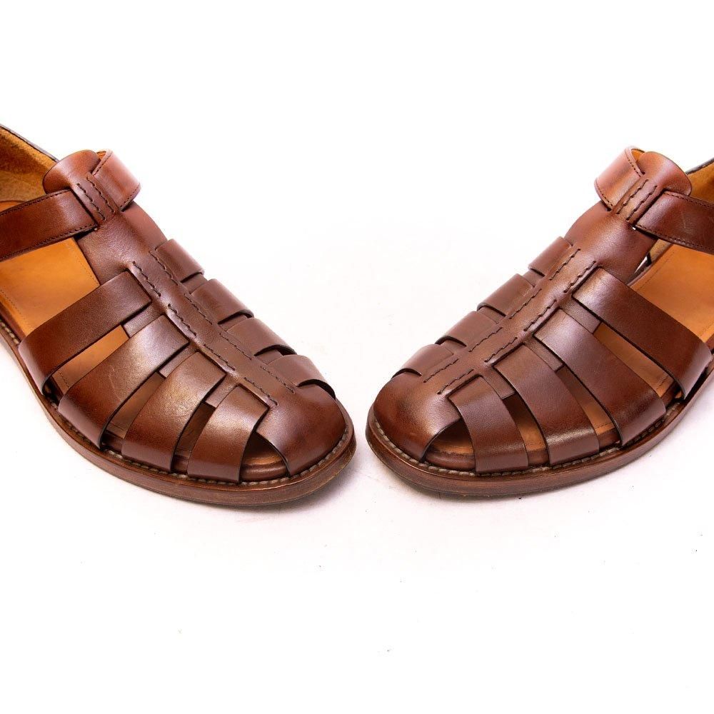 チャーチのフィッシャーマンはテープ状のパーツはやや細めの上品なグルカサンダル。ブラウンカラーが程よい軽快さを感じさせ、鮮やかな色味の靴下で遊ぶのもおすすめです。踵内部に調整跡がございますが、着用1、2回程度の状態。