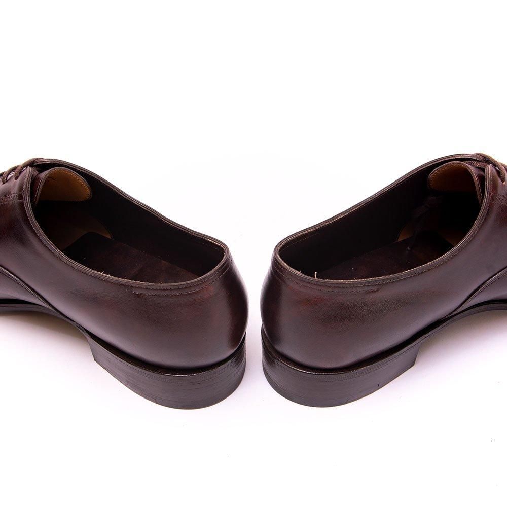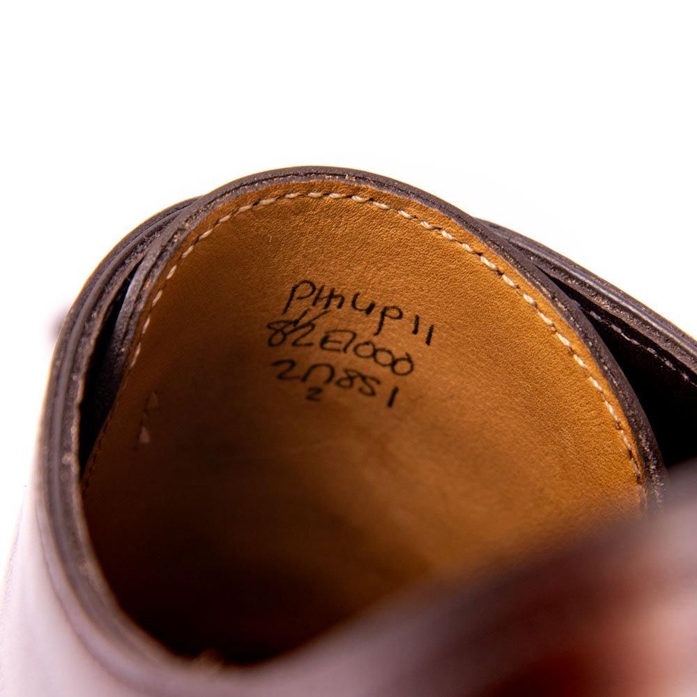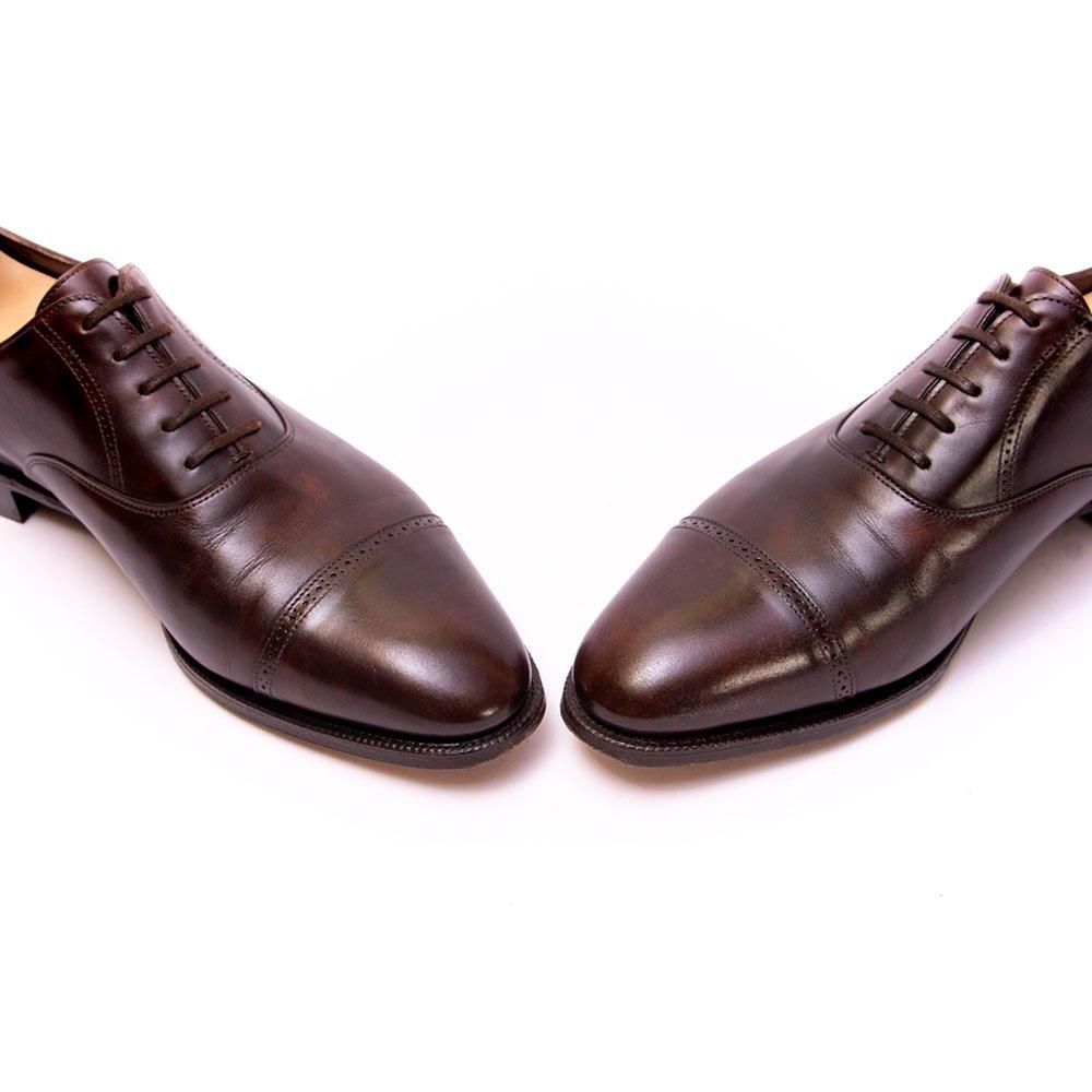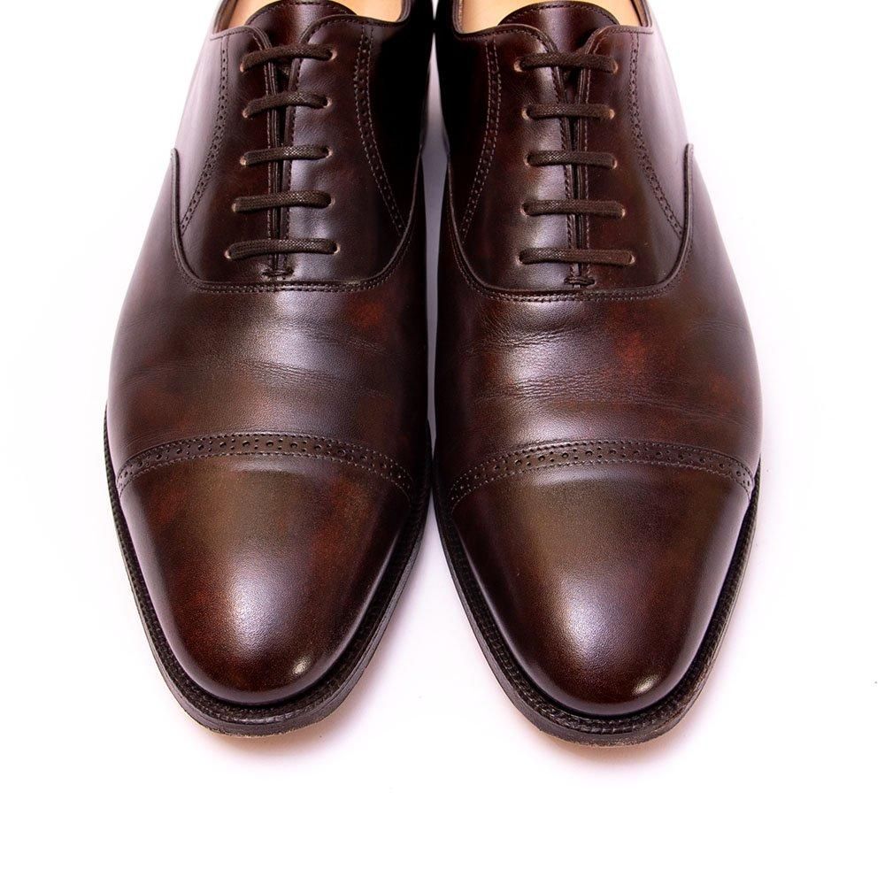 ジョンロブが誇る看板ドレスシューズ。控えめなパンチングは最低限の加飾として彩りを与えています。濃淡のグラデーションが美しいダークブラウンミュージアムカーフは光の当たり方でも見え方が異なります。使用10回以下。