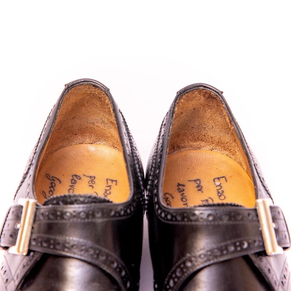過去のモデルを復刻したビームス別注のフルブローグのシングルモンク。重厚でしっかりと主張する大きめの穴飾り、バックルデザイン。エンツボナフェらしいピッチドヒール仕様のエレガントな後ろ姿も持ち合わせています。
