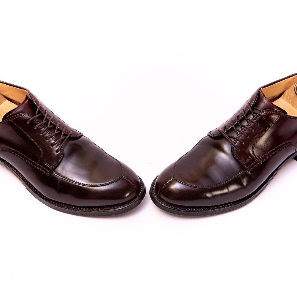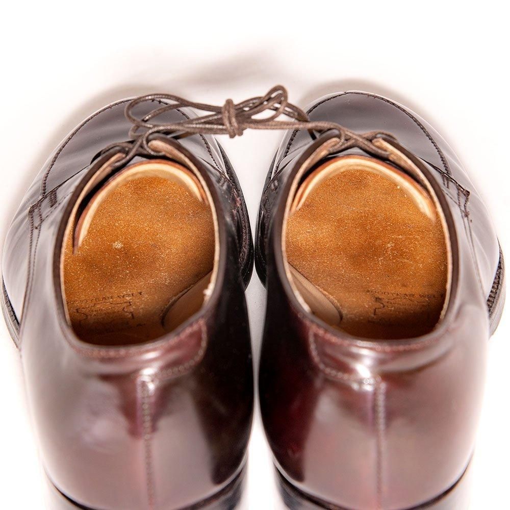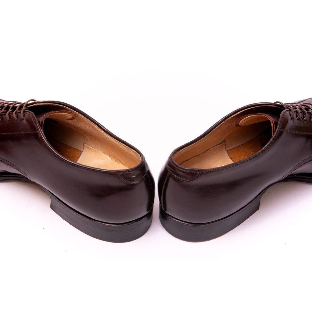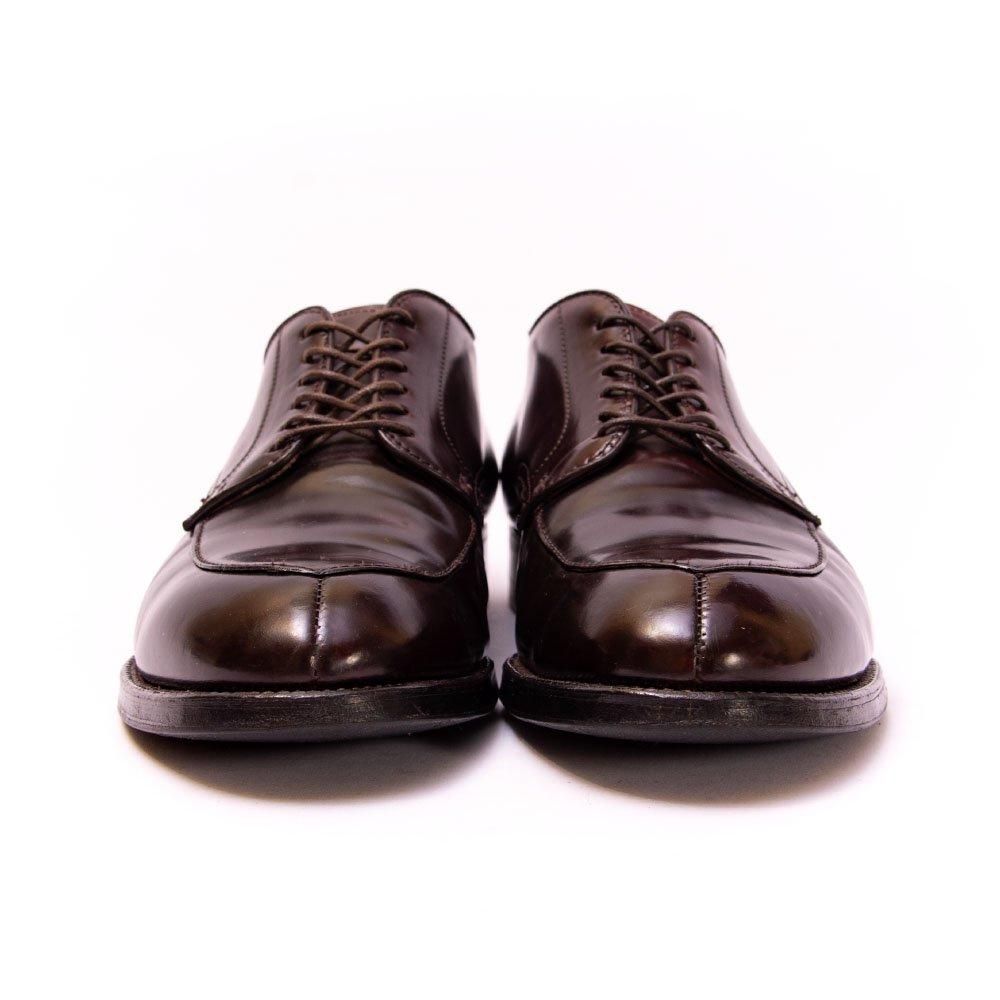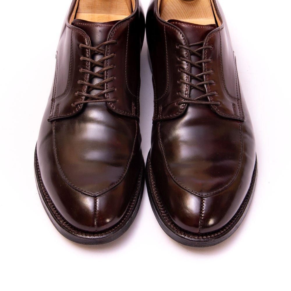 包み込んで歩きやすいモディファイドラスト、普遍的デザインのVチップのオールデンを代表するモデル。右足ヴァンプ部分に小さなシミがございます。比較的早い段階でリフト交換され、中底の沈み2ミリ以下。色味も均等に美しい個体です。