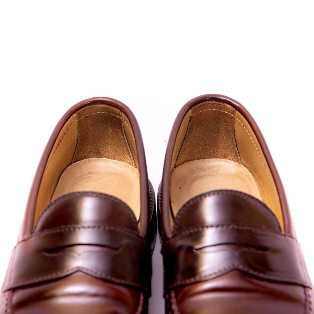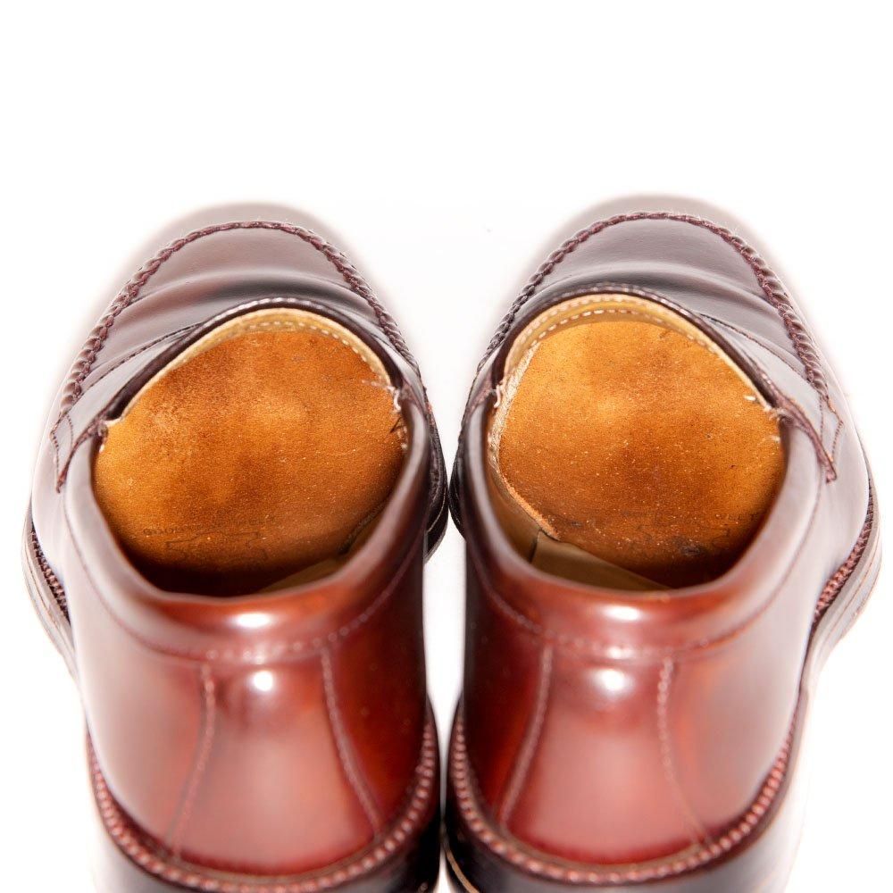 オールデンの99162は日本仕様のヴァンプの長いコードバンコインローファー。こちらは中底の沈み1ミリ前後と着用回数は比較的少ないものの、左足のサドルの付け根に小さな裂けがございます。