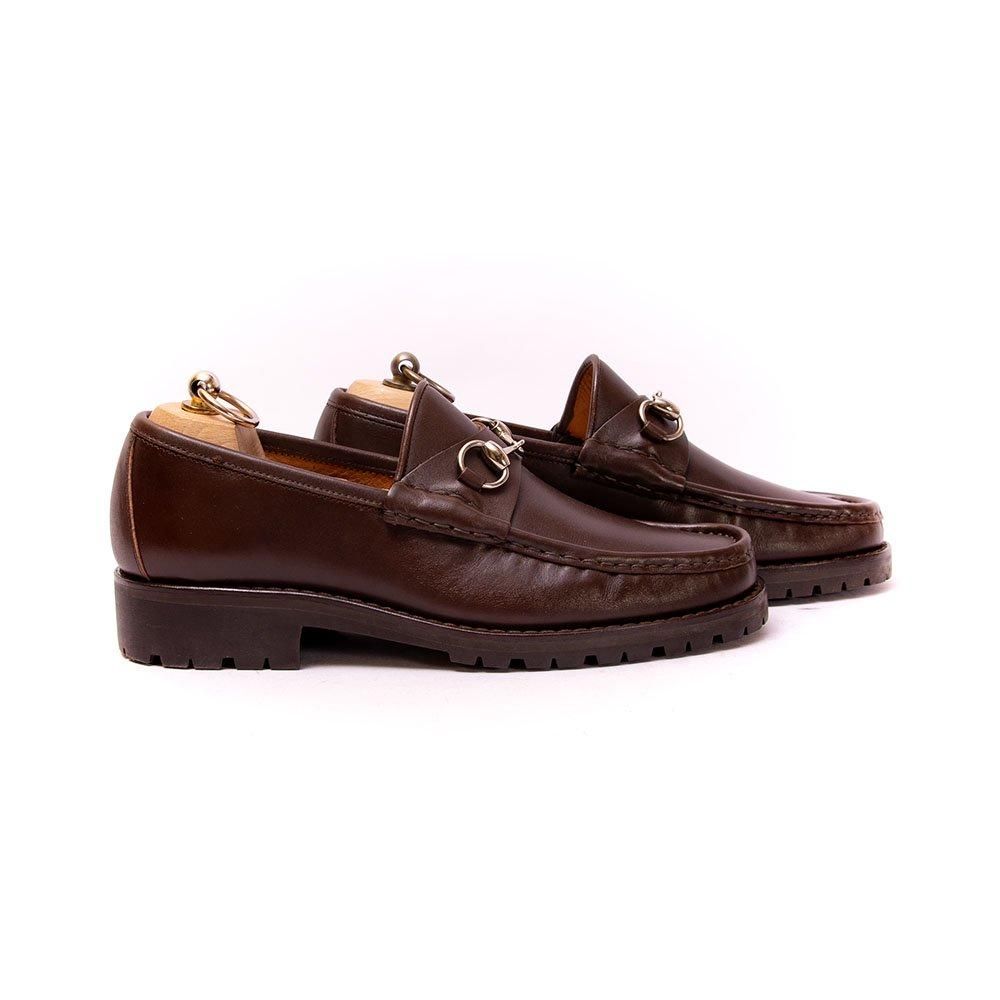 グッチのビットローファーで意外と探すと見つからないシルバーカラーのビットタイプの一足。ダークブラウンの落ち着いた雰囲気で幅広いスタイリングに合わせやすいです。着用数回程度の状態、タンクソール仕様で小雨の日にも着用できます。
