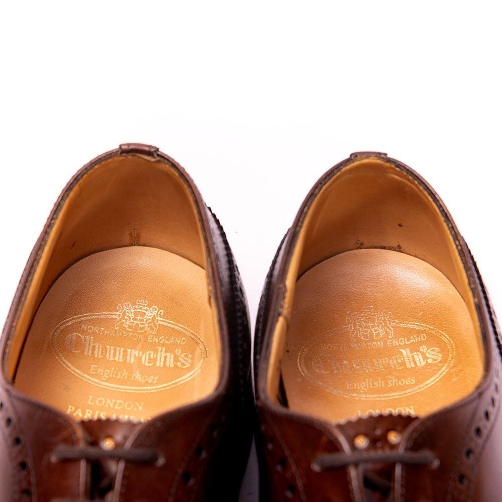 チャーチの大人気フルブローグモデルです。ビジネスシーンからカジュアルシーンまで汎用性の高さも人気のブラウンカラー。飾り穴の大きめのデザインが、クラシックな存在感のある1足です。使用感はありますがソール削れ等は軽微です。