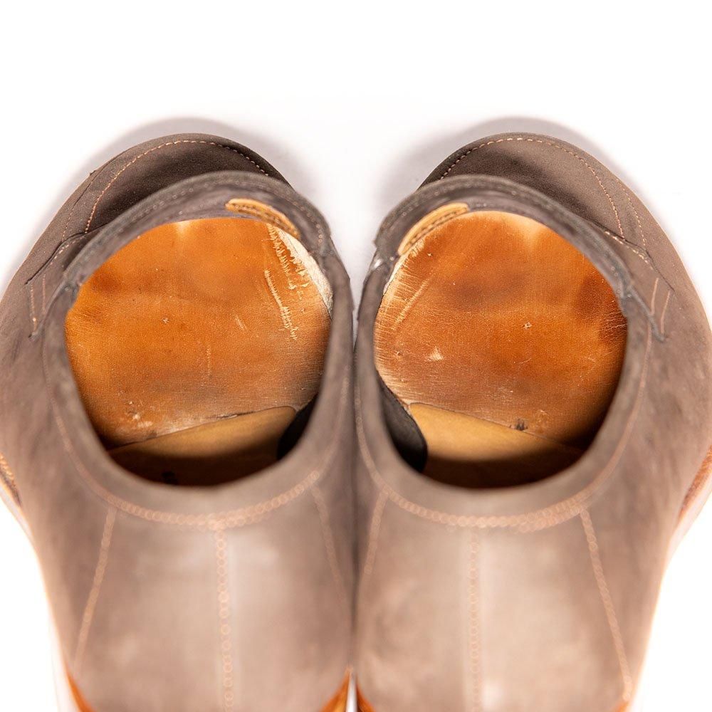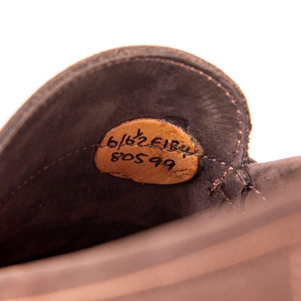 しなやかなヌバック素材とアンライニング仕様の楽に履けるコインローファー。チョコレートと名付けられたカラーとオレンジのステッチのコントラストでデニムなどとマッチします。部分的にシミやヌバック特有の小さな傷がございます。