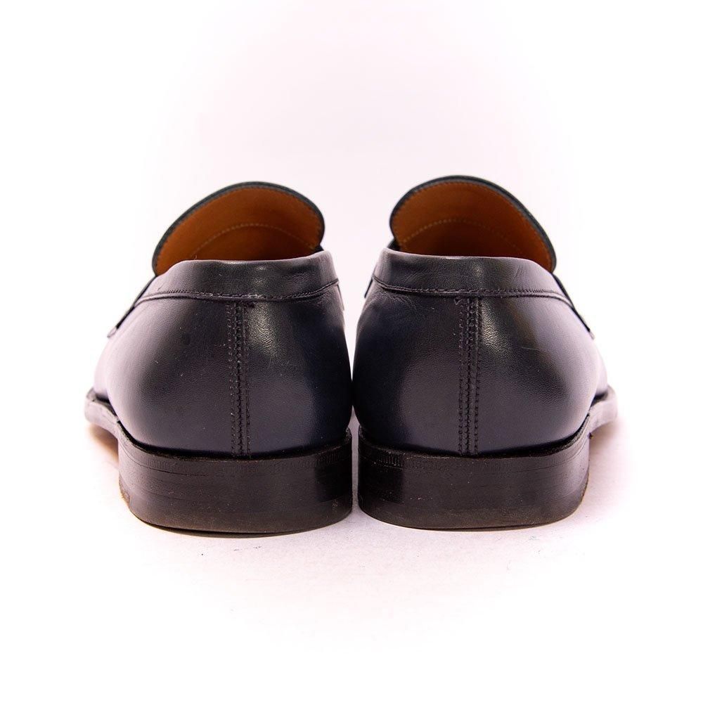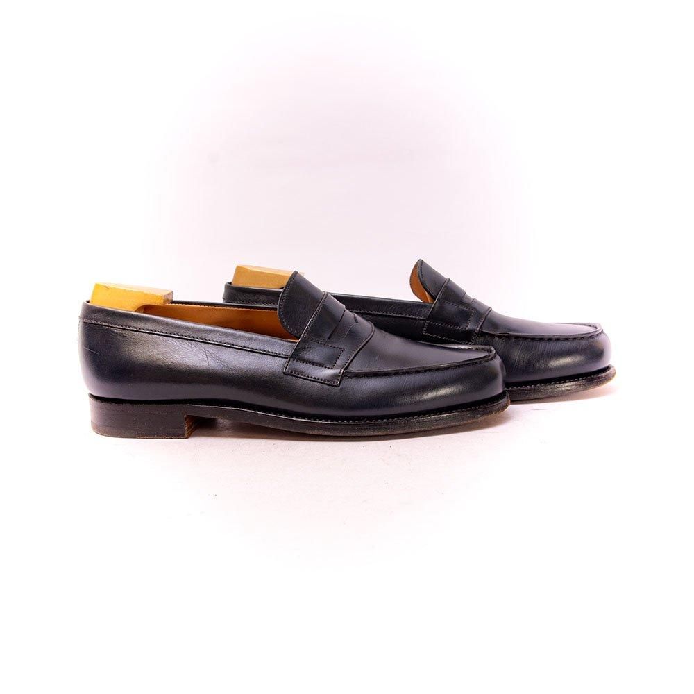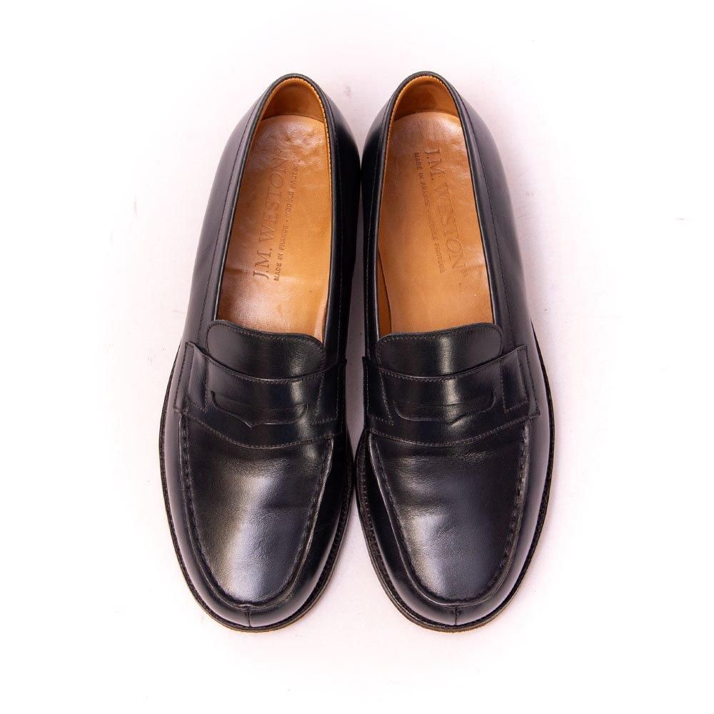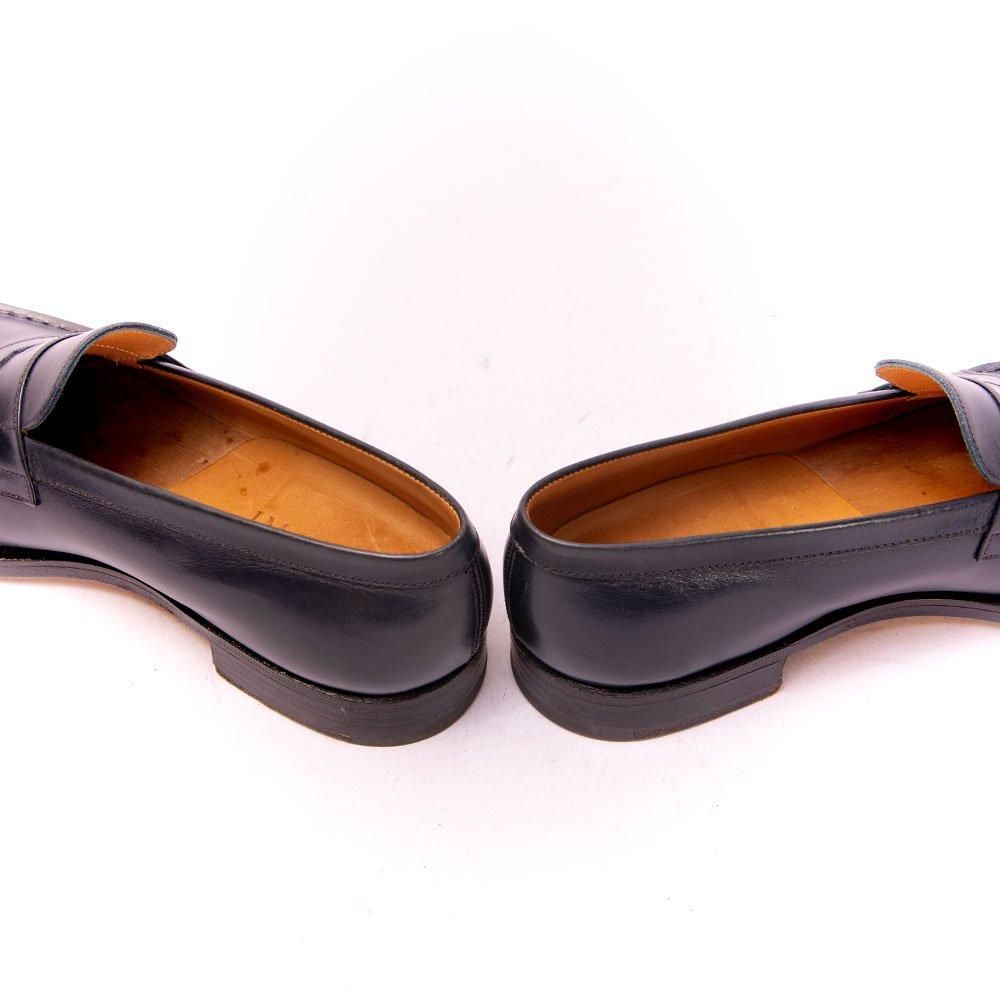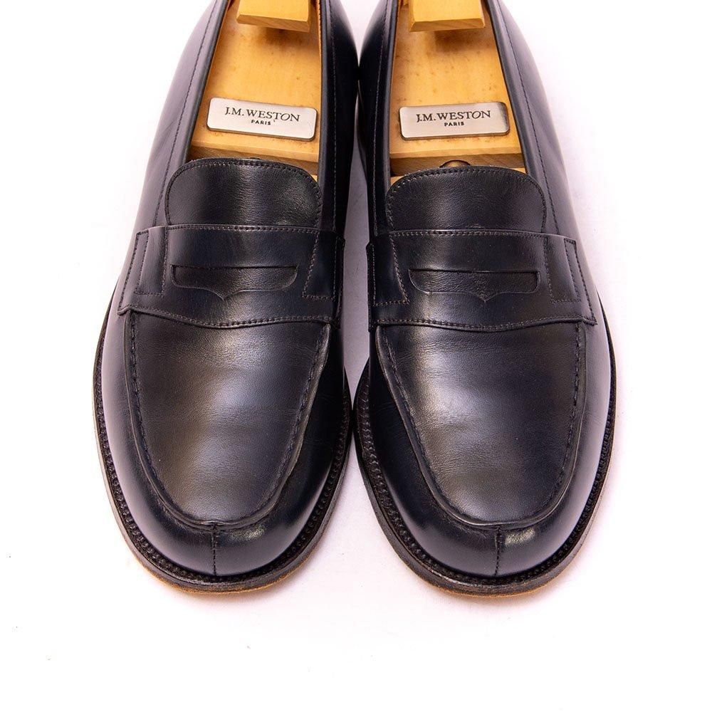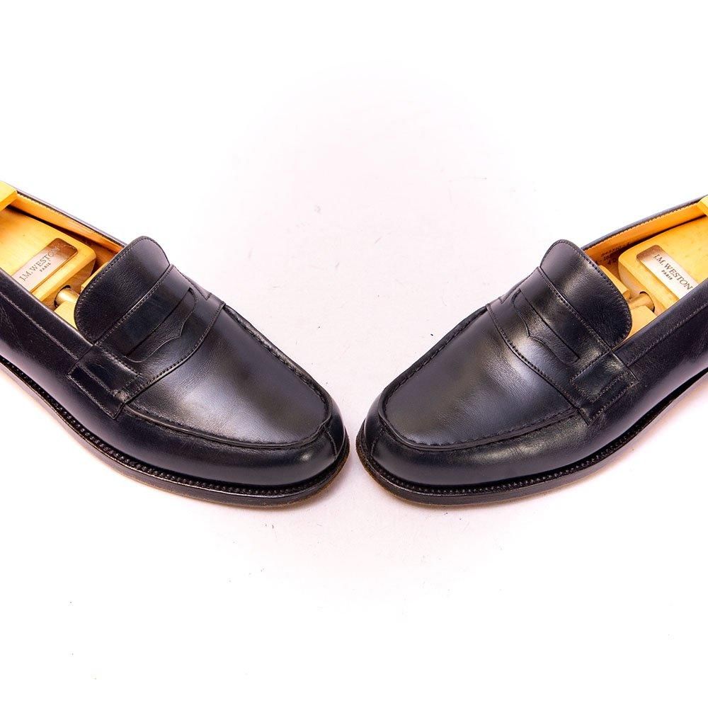 JMウエストンを代表するローファーモデル。お色は深みのある濃いネイビーで、デニムは勿論、ホワイトパンツを合わせると間違いない一足となります。踵の一部に小さな傷が見られますが、リフトの減りなど使用感は少なめです。
