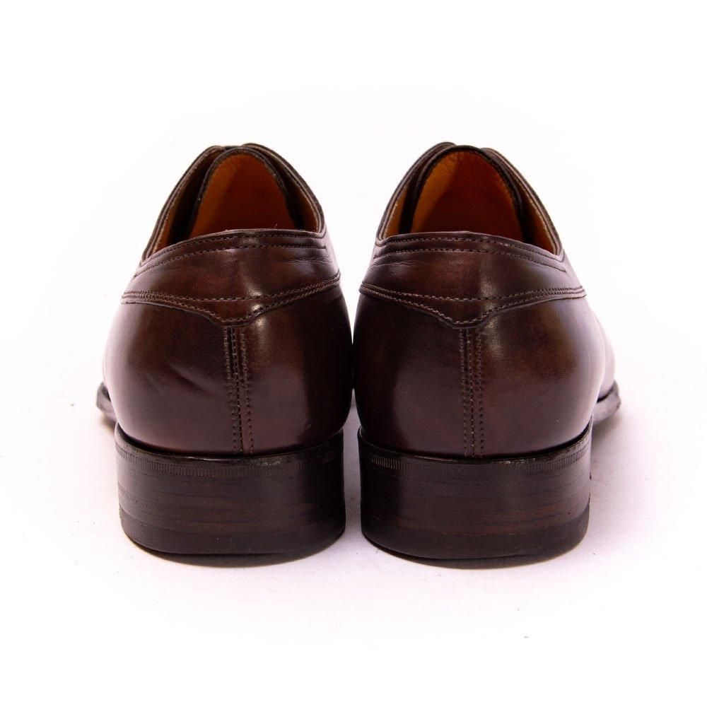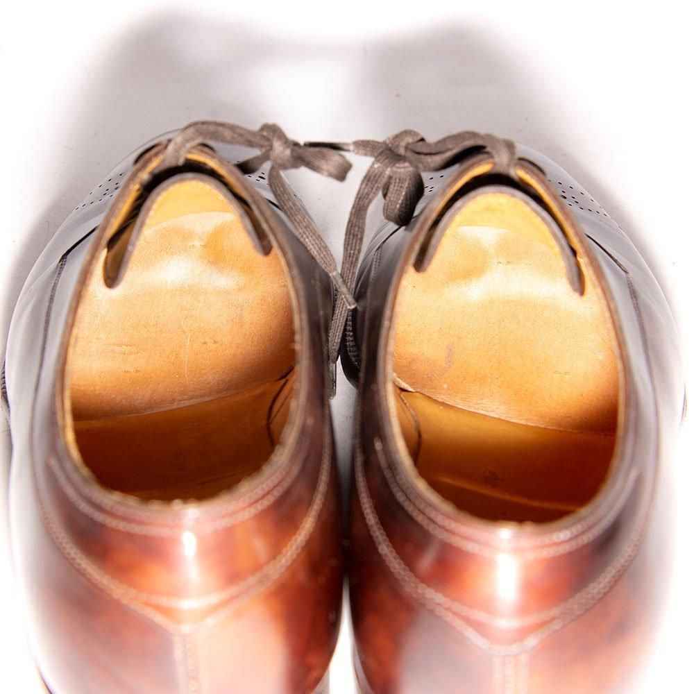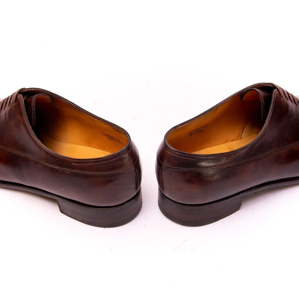 往年の英国靴を踏襲した6アイレットのバルモラルプレーントゥのイヤーモデル。横一直線のサイドの切替のステッチが踵で繋がる凝ったデザイン。右足つま先に僅かに小傷がありますが、その他使用感少ない概ね美品の状態です。