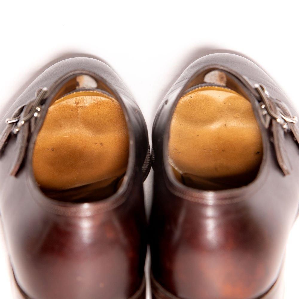 ジョンロブの技巧の詰まった一枚革のシンプルなダブルモンクのイヤーモデル。サイドはスキンステッチ仕様、上品な濃淡のミスティカーフとオリジナルのバックルが洗練された印象。ストラップ部分にひび割れがあるため、通常よりお値段据え置きにております。