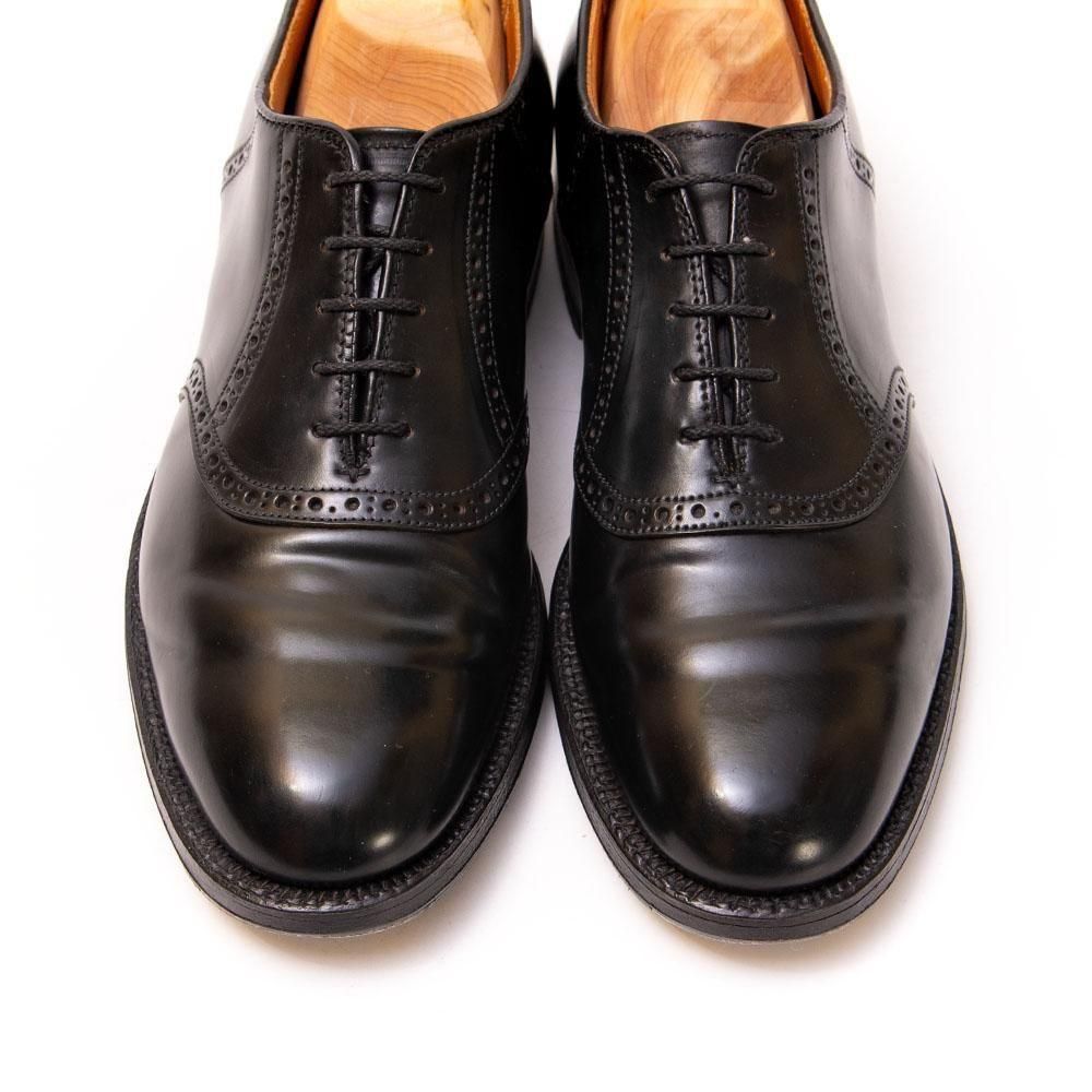 同色同素材のサドルシューズ。ブラックコードバンの深い光沢で落ち着いた雰囲気ですが、バリーラストの幅の広めの設計とボリューム感でカジュアルスタイルにも。中の使用感はありますが沈みはあまり無く、アッパーは比較的綺麗です。肉厚の個体。