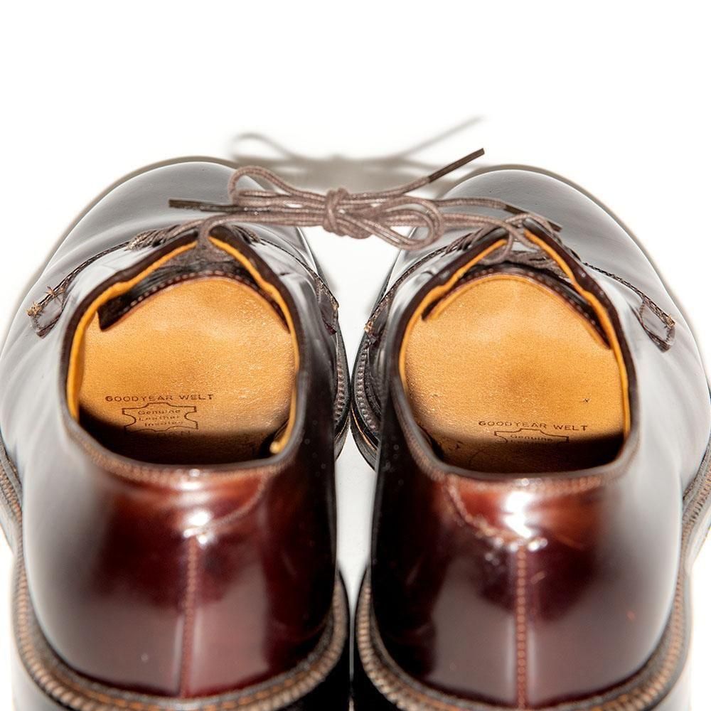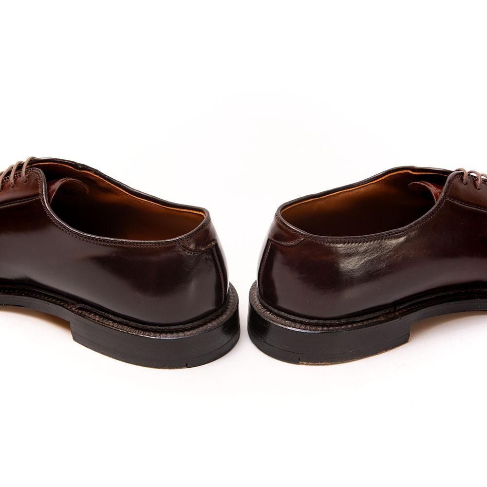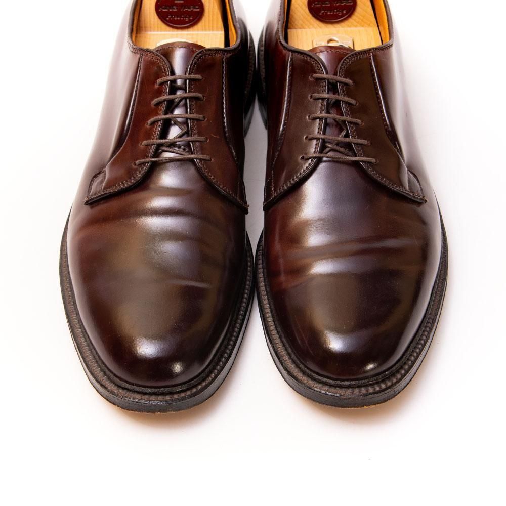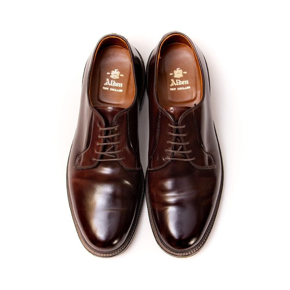 オールデンと言えばの定番モデル。深みのあるバーガンディとクラシックなプレーントゥは長く愛用いただけるかと思います。コードバンの光沢のある素材感と穿きこむことで味わいのある経年変化を楽しめる一足。使用数回程度の極美品。