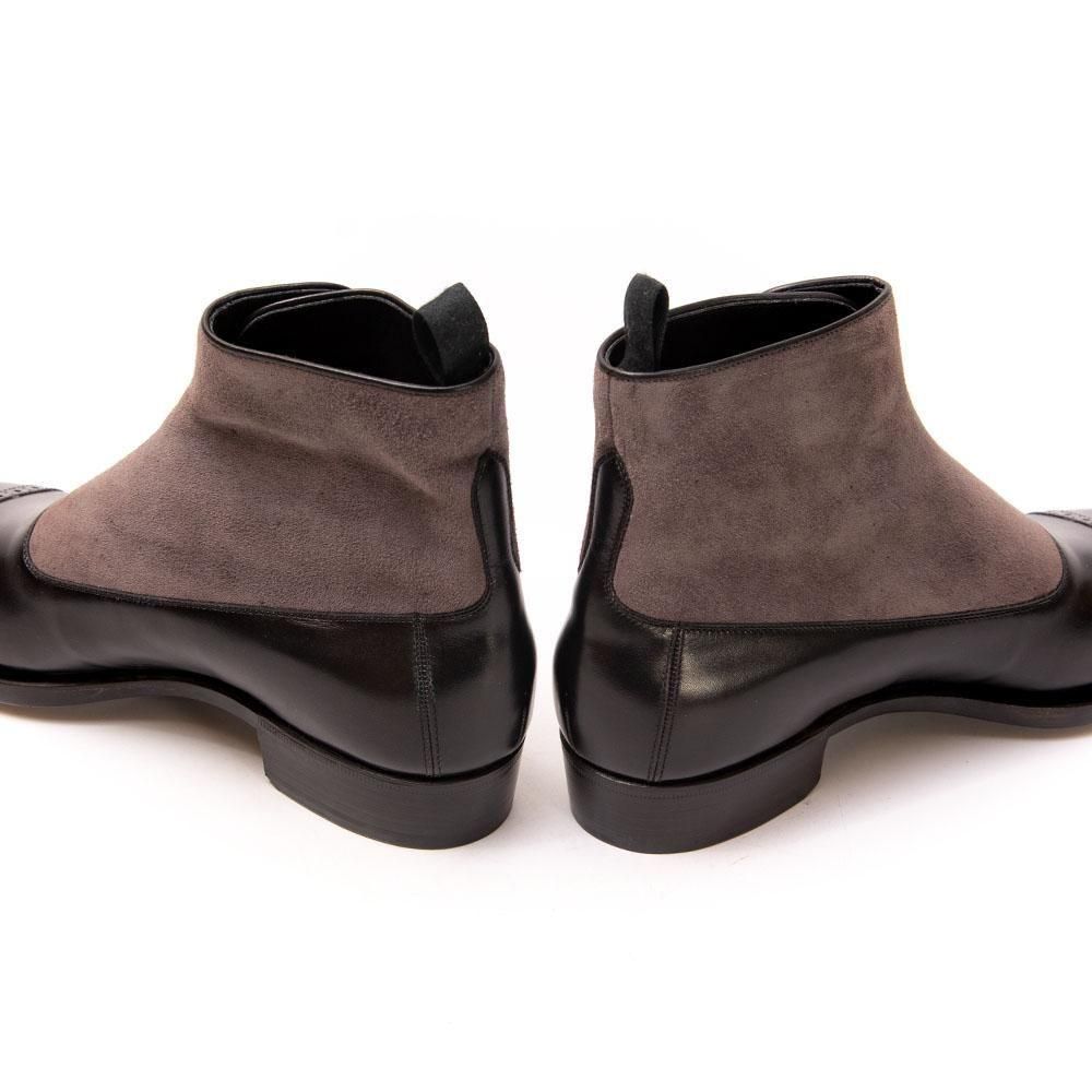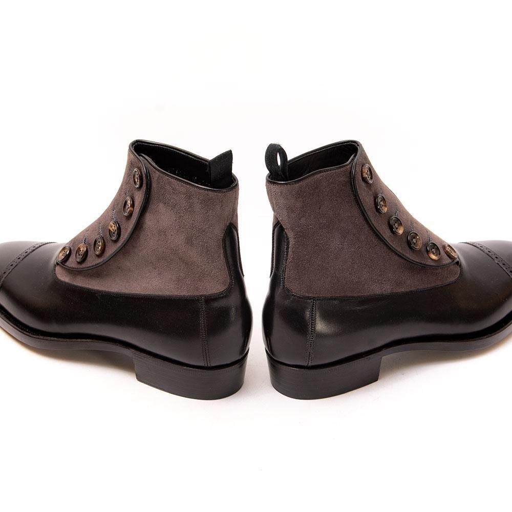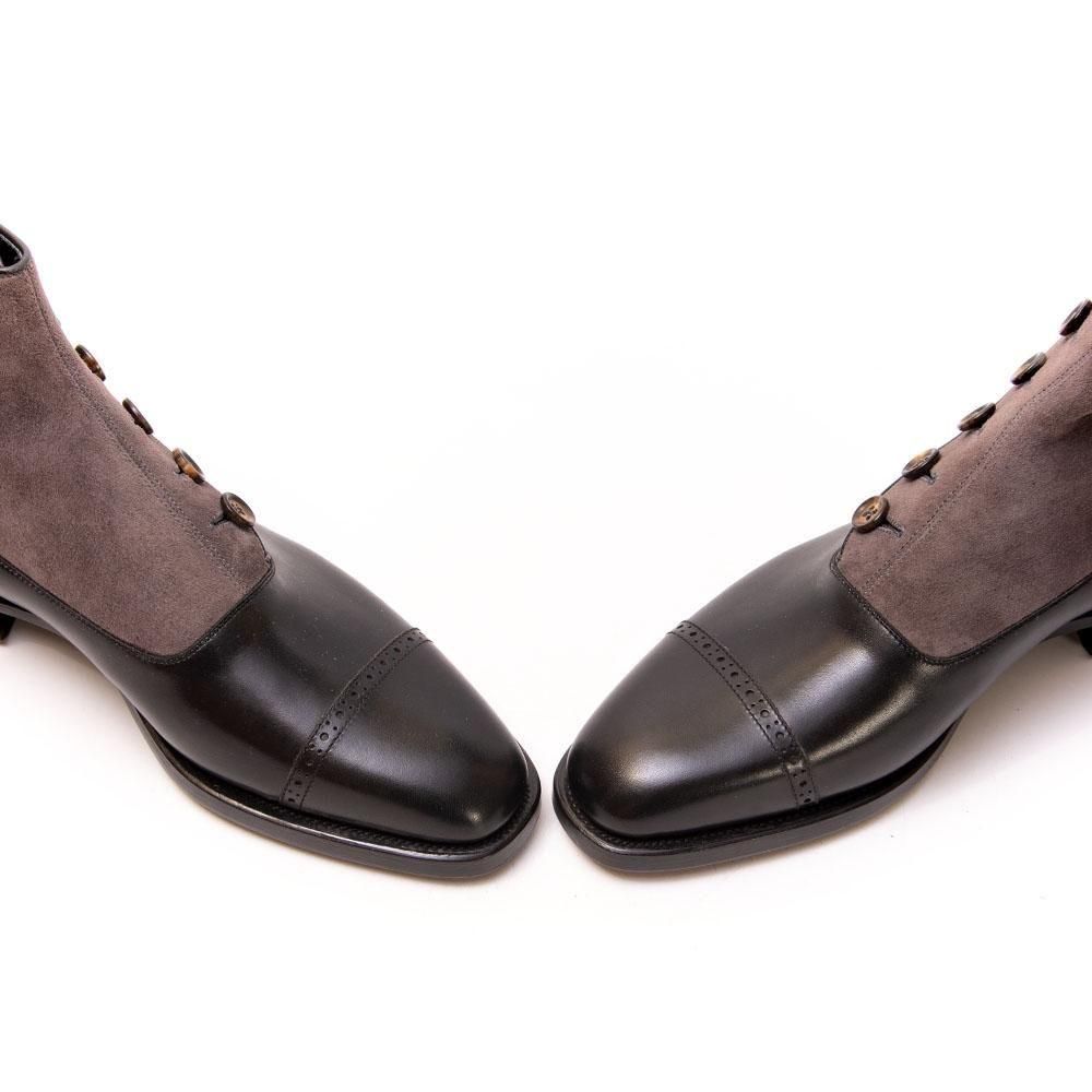 日本老舗の大塚製靴が作る長い歴史を誇るクラシックなモデルのボタンブーツ。ブラックのカーフとグレースエードの切り替えや水牛ボタンなど随所にこだわりを感じられます。フォーマルスタイルのアクセントになる一足です。