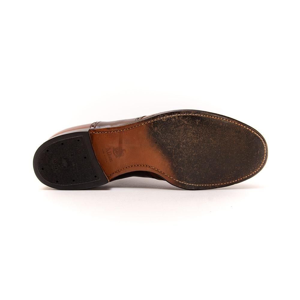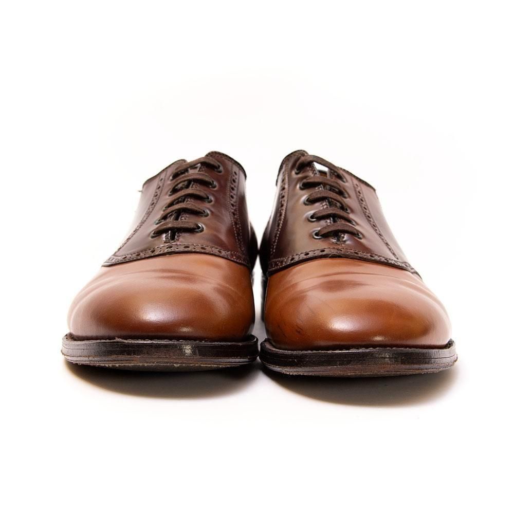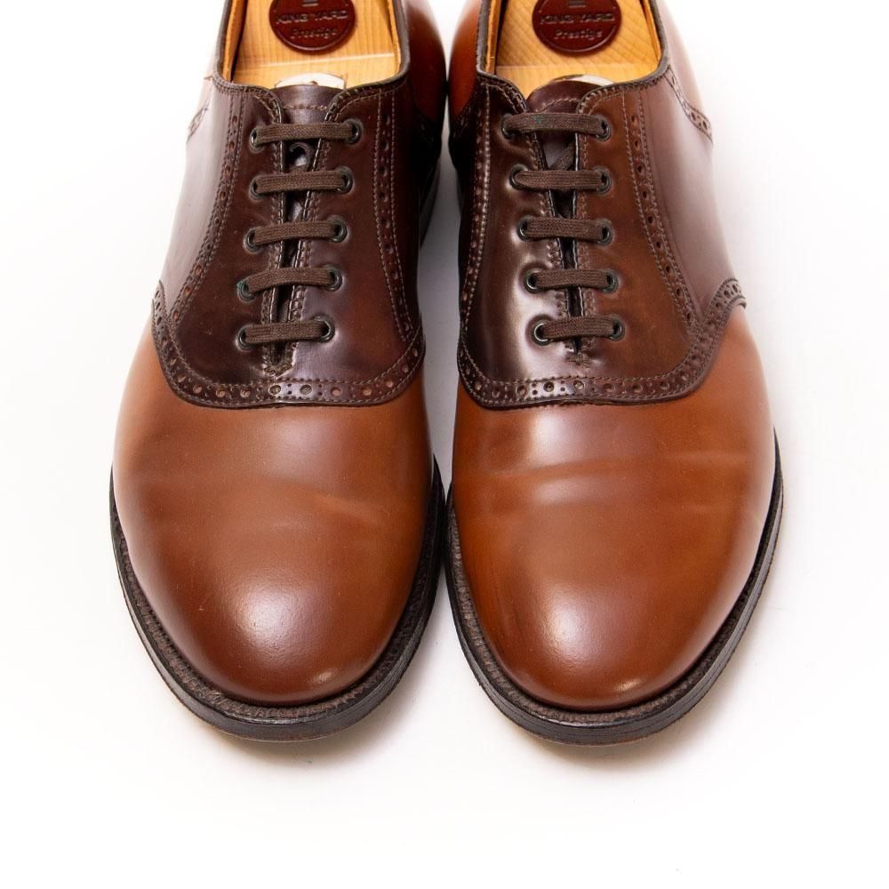 アメトラのサドルシューズにバーガンディとレアカラーのウィスキーコードバンでコントラストがはっきりとしたアクセントになる一足。モディファイドラスト採用で快適な履き心地。踵内部の擦れがございますが、着用回数少ない状態です。