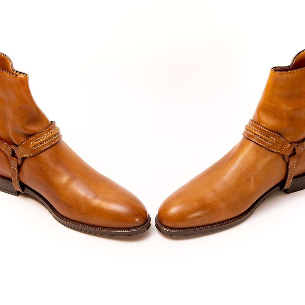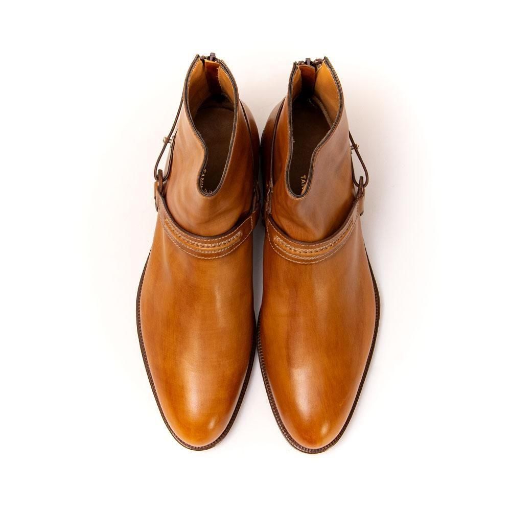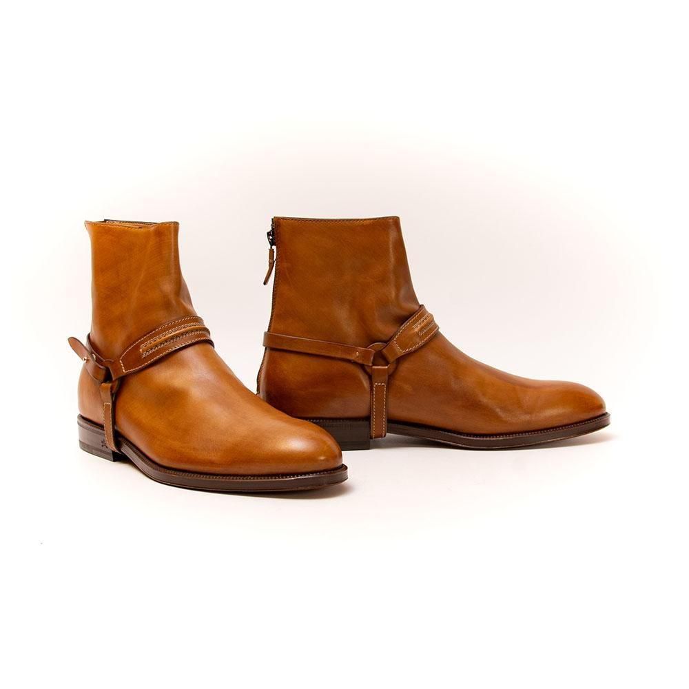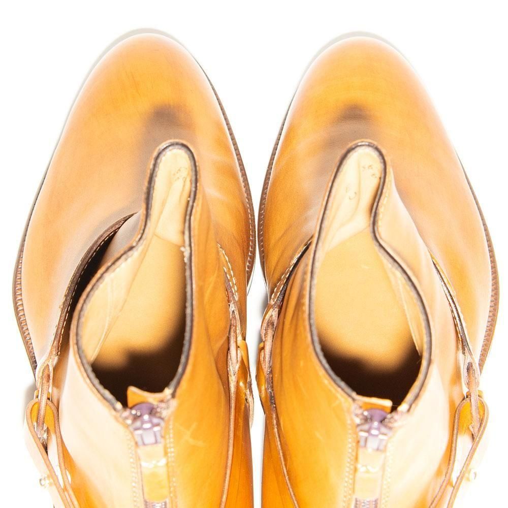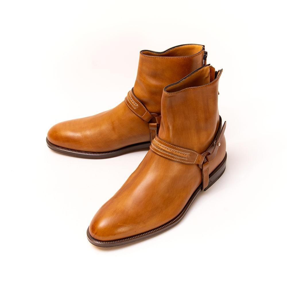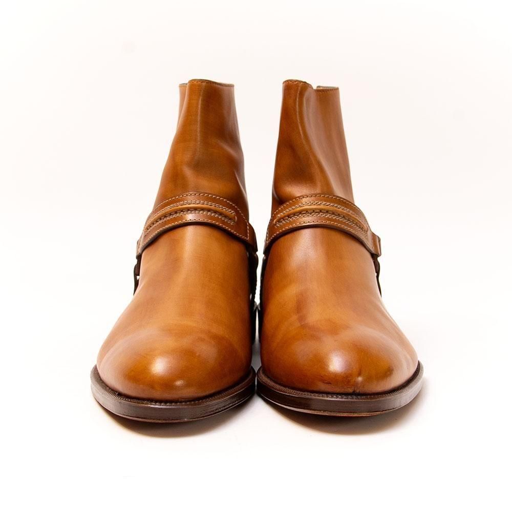 イタリアの名門タニノクリスチーのモダンなハーネスブーツ。2つのリングにストラップが巻き付けられた無骨さが魅力。黄みのブラウンカラーで統一されウエスタンな雰囲気が楽しめます。希少な未使用品。