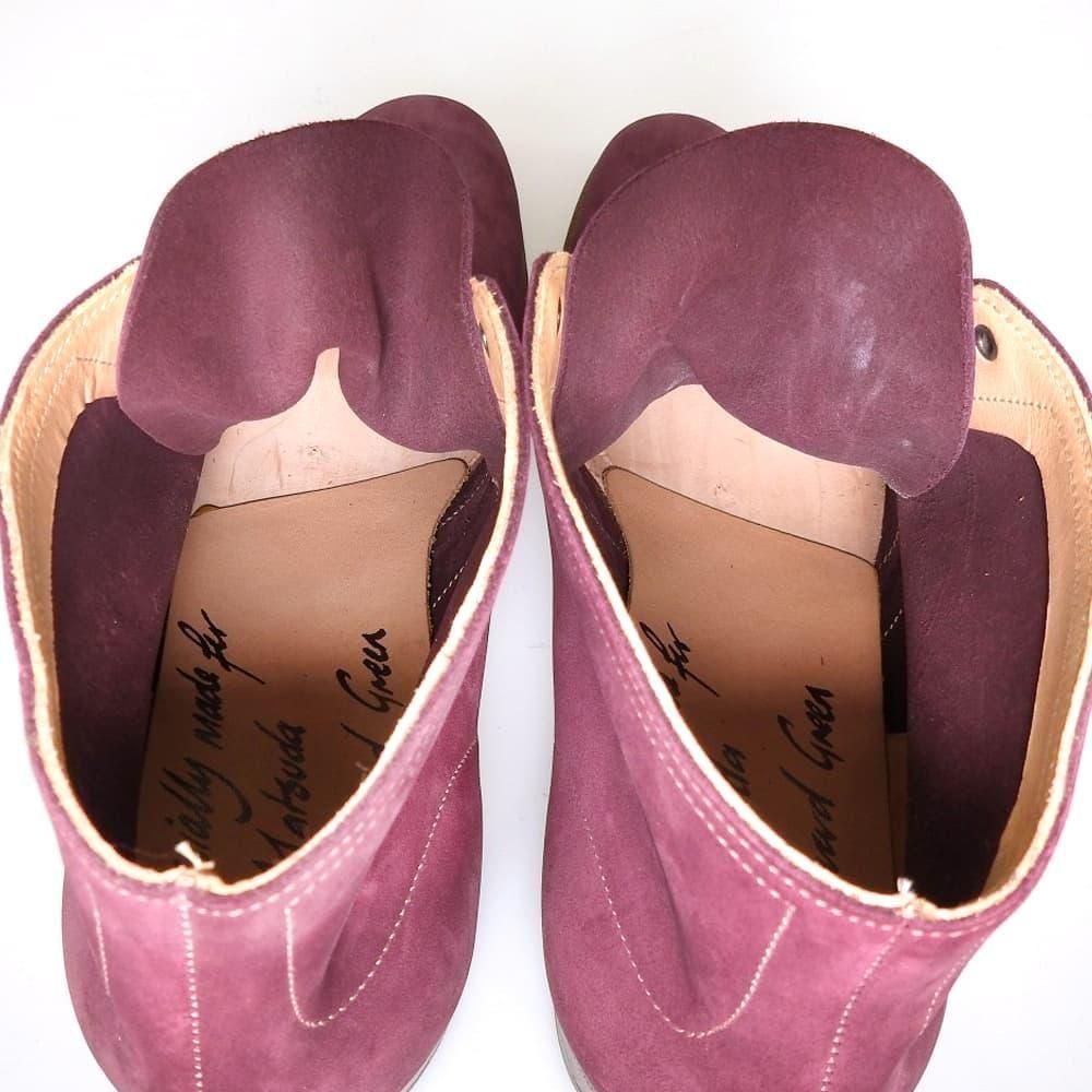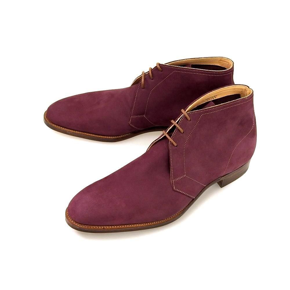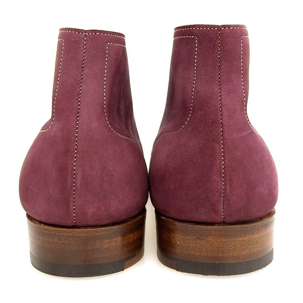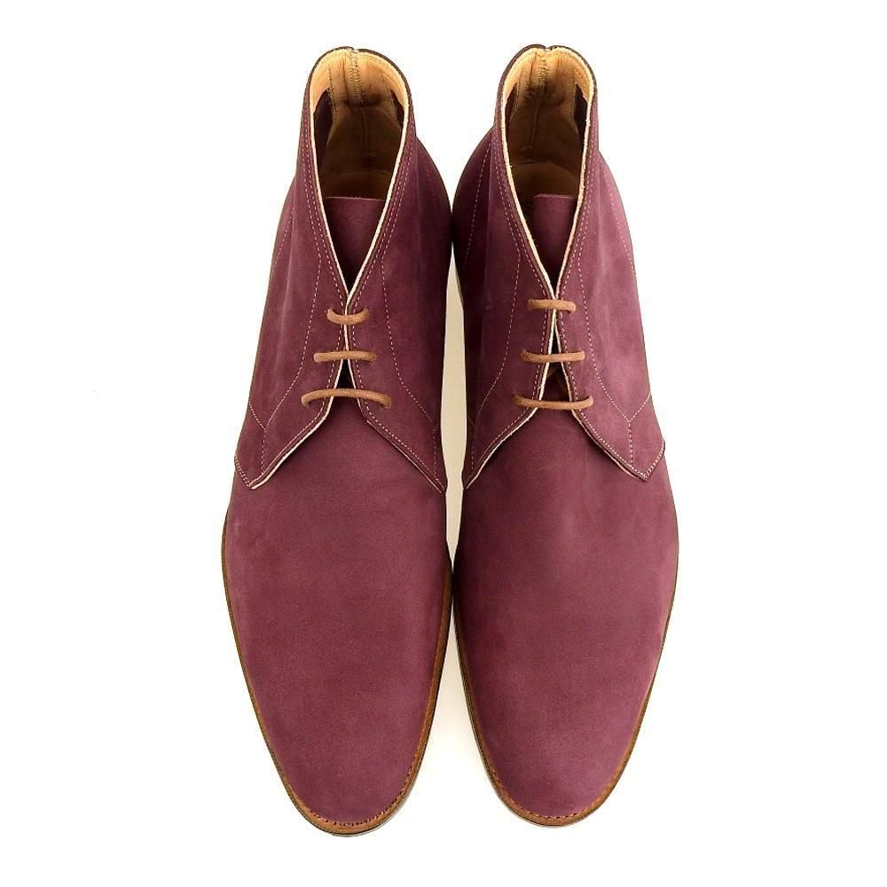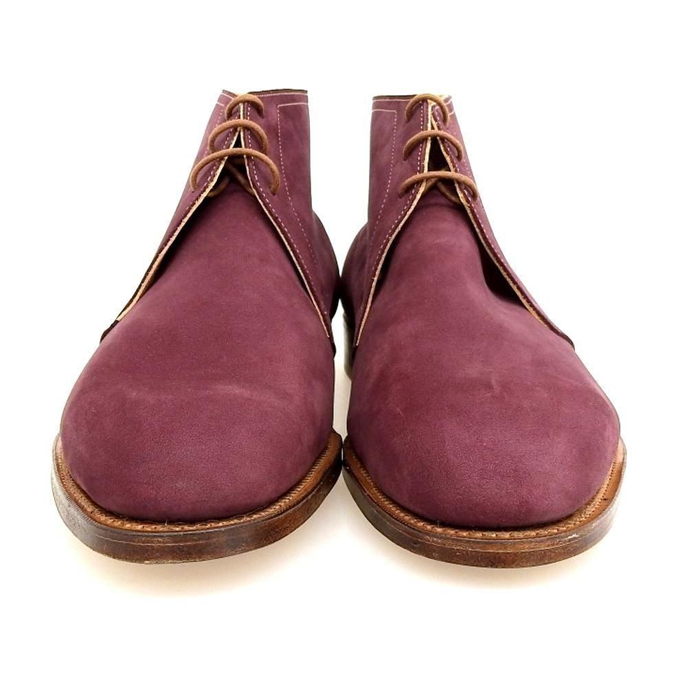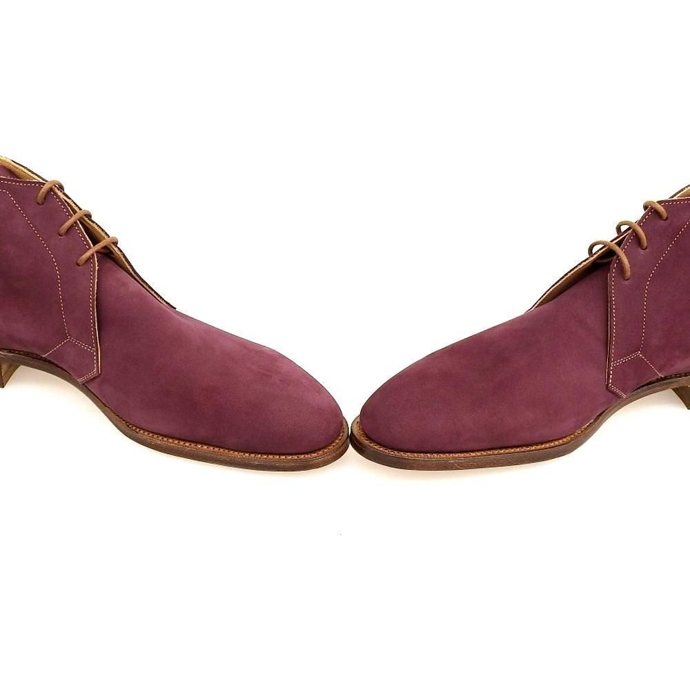 深みのあるバーガンディーのヌバックのチャッカブーツ。秋冬の暗くなりがちなファッションに華やかさを添えてくれる一足です。シャープでかつ上品なシルエットの82ラストを採用。試着程度の未使用品となります。