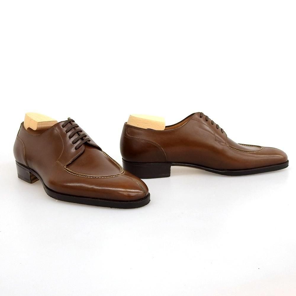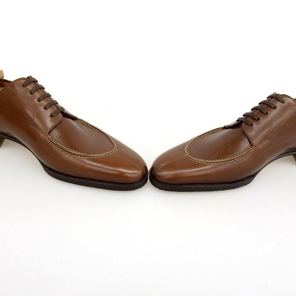 エプロンフロントダービーのデザインをベースに、無骨な要素を排除しシンプルかつエレガントに仕立てた一足。見た目以上に着用した際のシルエットがより絞られれて見え、ドレープの効いたパンツやビジネスシーンでもご愛用可能です。未使用品、純正ツリー付属