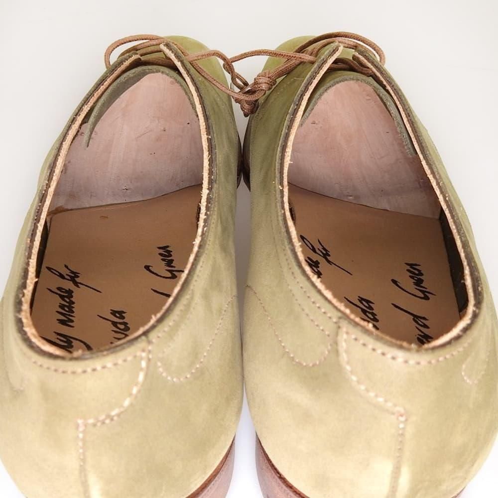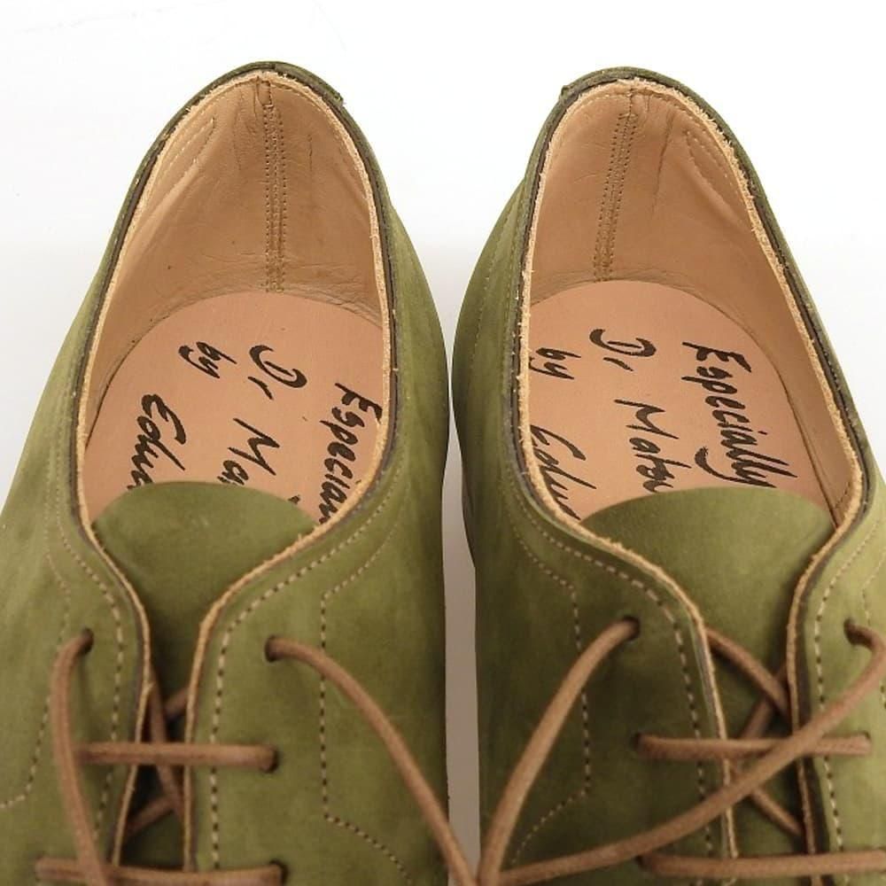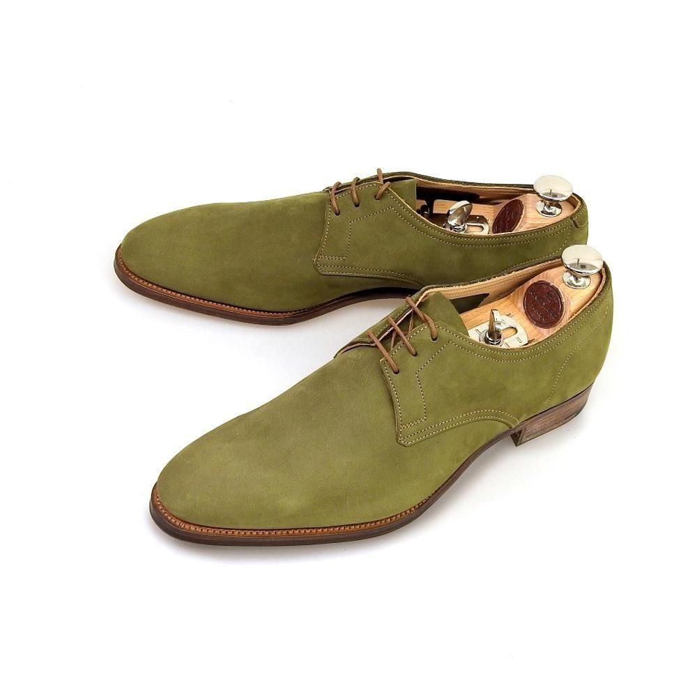 通常展開のほとんどない珍しい唯一無二のカラーリングのオリーブヌバックを使用したダウニング。シンプルなプレーントゥながらもアイボリーのステッチやナチュラルコバのカントリーライクな一足です。