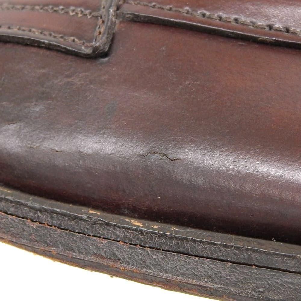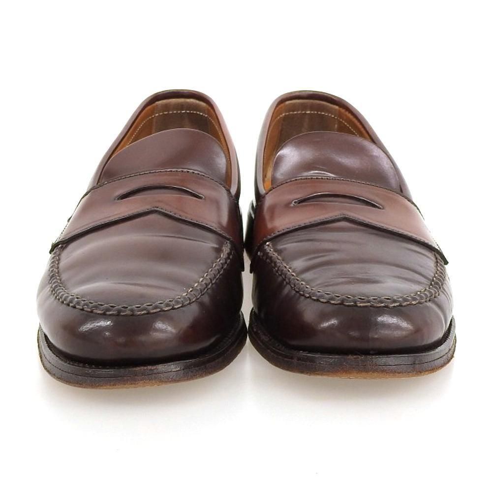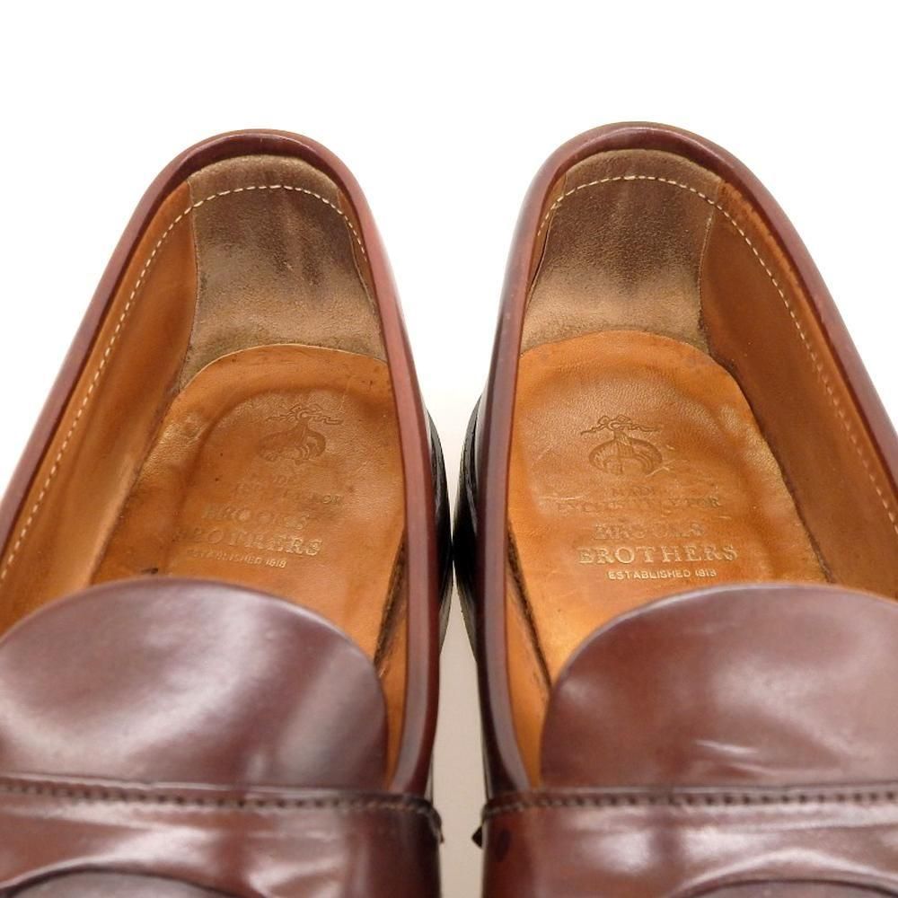 ブルックスブラザーズ名義の名作アンラインドペニーローファー。幅の広いラウンドトゥに手縫いのモカが素朴さを感じさせます。こちらは屈曲部のモカ、モカ付け根と左足外側サイドラインにひび割れがございます。