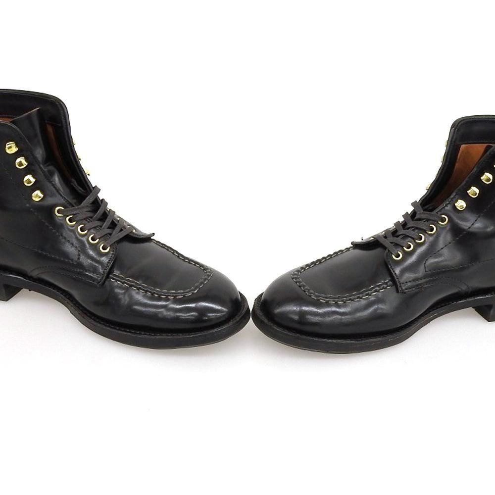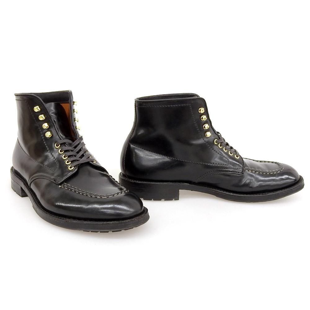輝くブラックコードバンに金ハトメのコントラストがオールデンファンの心を揺らすアメリカのショップ別注品のインディブーツ。ハーフコマンドソール仕様はグリップ力もあり実用度の高さが魅力。着用回数は15回前後と美中古品です。