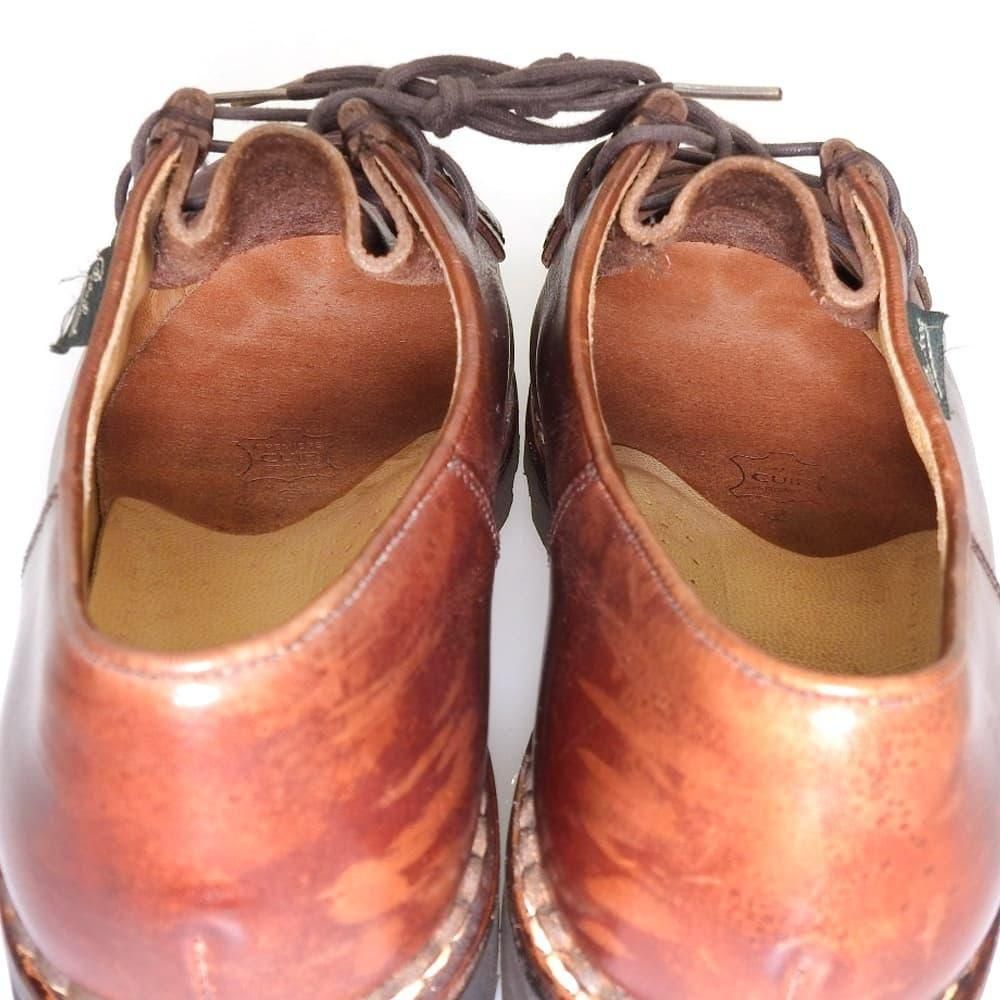パラブーツを代表するミカエル。アッパーにシミ、踵スレがありますが、アッパーに傷はなくツヤ感のあるきめ細やかかつ肉厚な革個体。休日のカジュアルスタイルに最適で、マロンカラーがコーディネートに上品さと存在感をプラス、少しラフに履きたい方にもおすすめです。